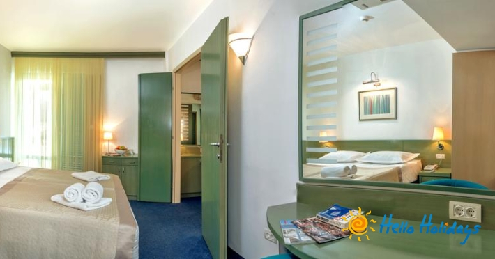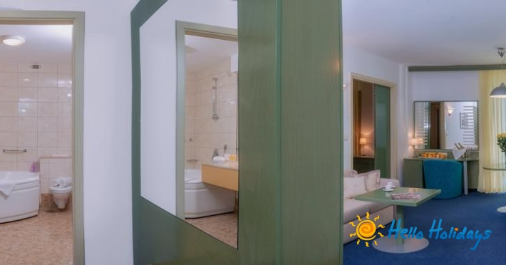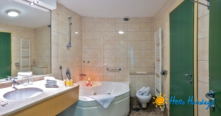 Hotelul dispune de un restaurant, 190 de camere confortabile, plaja privata, centru wellness cu piscina mare exterioara cu apa sarata, piscina mica pentru copii, fitness, baie turceasca, centru de frumusete, masaje, posibilitate organizari nunti, echipa de animatie, centru de tenis, volei, fotbal, baschet, handbal.