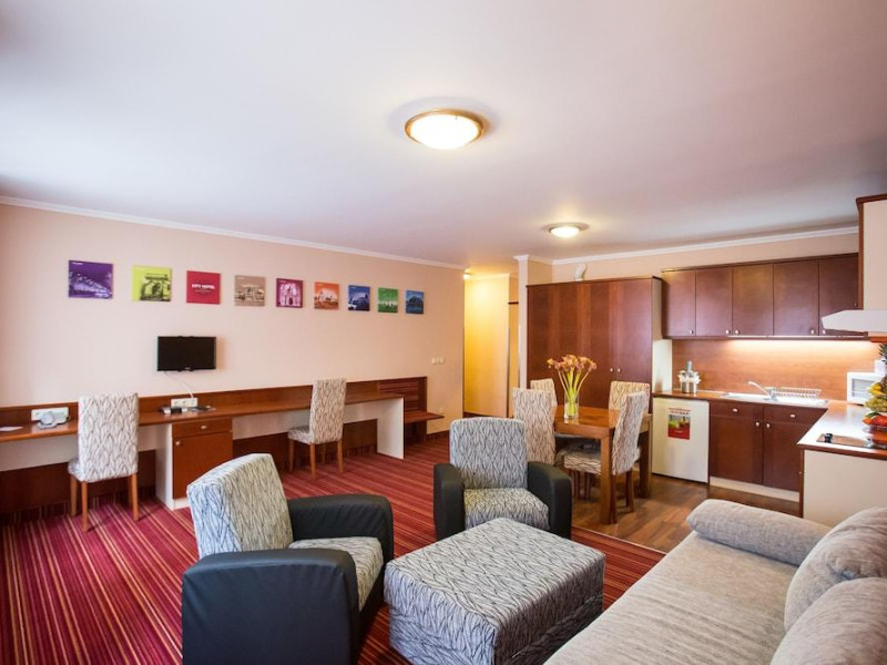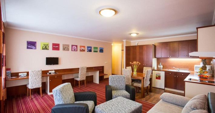 El apartotel estandaacute; situado en pleno centro de Budapest, en la zona comercial y de negocios, a solo 1 minuto a pie de la parada de la landiacute;nea de tranvandiacute;a mandaacute;s larga de Europa.El apartotel ofrece 22 apartamentos de distintos tamaandntilde;os repartidos en 4 plantas, adecuados tanto para viajes de negocios como para visitar Budapest en familia. El hotel fue renovado en 2010 y da la bienvenida a sus huandeacute;spedes en un vestandiacute;bulo con servicio de salida y de recepciandoacute;n 24 horas. Ademandaacute;s, dispone de ascensor, cafeterandiacute;a, bar y sala de desayunos. Asimismo, hay un garaje a disposiciandoacute;n de los huandeacute;spedes bajo el hotel y estos tambiandeacute;n pueden hacer uso de la conexiandoacute;n a Internet WiFi y del servicio de lavanderandiacute;a que se ofrece.Todos los apartamentos cuentan con un cuarto de baandntilde;o separado con ducha, baandntilde;era y secador de pelo. Ademandaacute;s, disponen de una cocina totalmente equipada con nevera pequeandntilde;a, microondas y cafetera/tetera. Las habitaciones estandaacute;n amuebladas con camas dobles y disponen de diversas comodidades como caja fuerte en la habitaciandoacute;n, radio, TV vandiacute;a satandeacute;lite/por cable, telandeacute;fono de landiacute;nea directa y conexiandoacute;n a Internet gratuita. El equipamiento de los apartamentos se completa con calefacciandoacute;n regulable.Los huandeacute;spedes pueden reservar para disfrutar de un tratamiento de masaje.Datorita dinamicitatii domeniului disponibilitatea ofertelor se modifica de la un moment la altul. De aceea ofertele sunt valabile in limita locurilor disponibile. Agentia nu este responsabila pentru eventualele neconcordante care pot aparea intre informatiile privind tarifele si alte detalii din site si informatiile primite in agentie. In aceste cazuri vor avea prioritate, intotdeauna, informatiile primite in agentie.