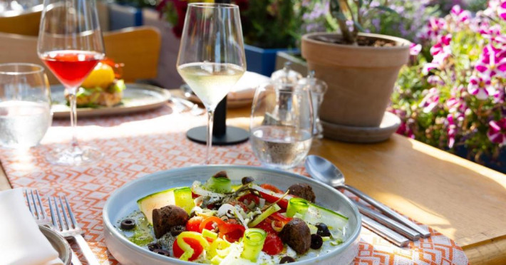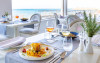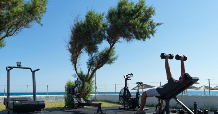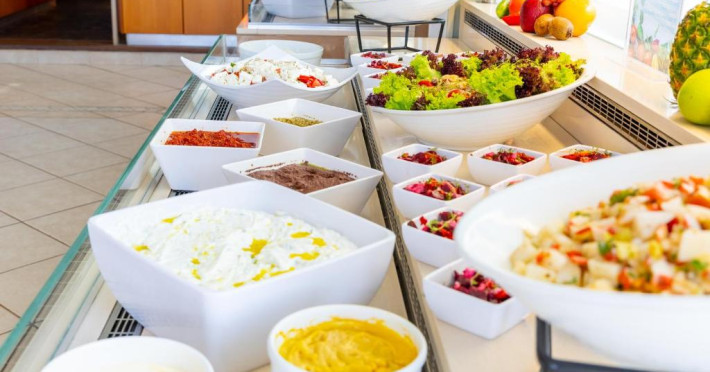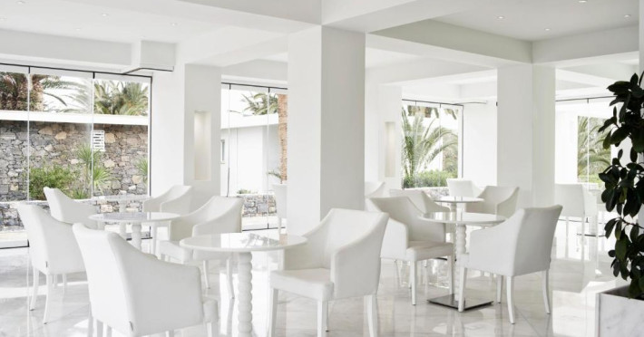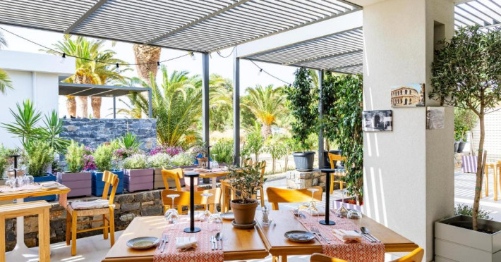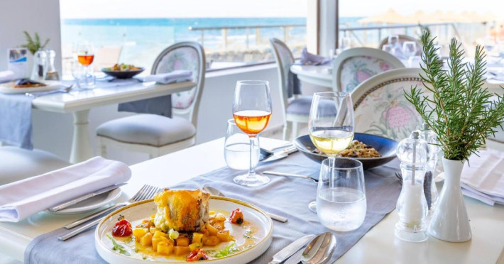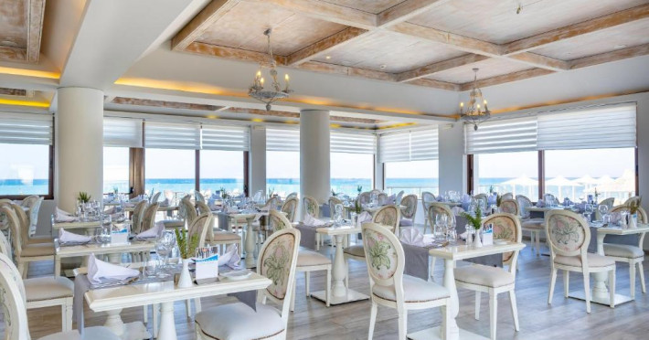 Situat aproape de plajă, restaurantul principal are vedere la Marea Egee și oferă mic dejun, pranz și cină in stil bufet. Restaurantul à la carte oferă mancăruri delicioase grecești și internaționale, salate de aperitive și deserturi.