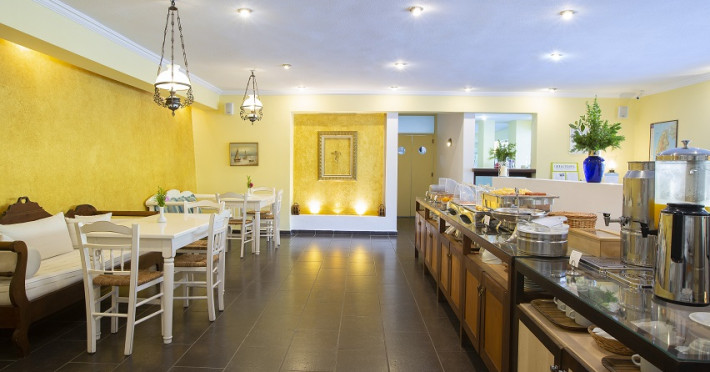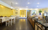 - Oaspeții se pot bucura de un mic dejun tip bufet în zona elegantă de mese, cu vedere la grădină sau la mare.