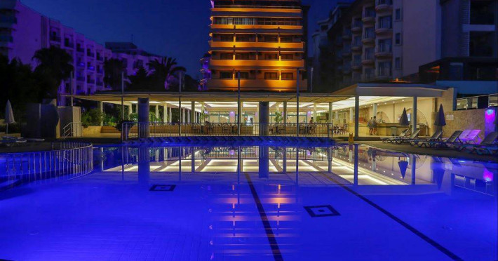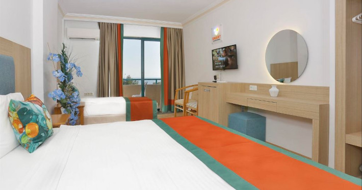 Hotelul nostru situat pe malul mării, se află la 6 km de centrul orașului Alanya, la 120 km de Aeroportul Antalya și la 55 km de Aeroportul Gazipaşa. Este conectat la plaja noastră privată printr-un pasaj subteran. Facilitati hotel: Facilitățile noastre includ 2 lifturi, o sală TV și de lectură, o sală de întâlniri, un bar în hol, un restaurant închis și un restaurant în aer liber. Proprietatea noastră este dotată cu două piscine, una conectată la o piscină pentru copii și cealaltă cu două tobogane. La terasele piscinelor și pe plajă sunt disponibile umbrele și șezlonguri, iar barurile de la piscină și de pe plajă oferă servicii în anumite intervale orare. De asemenea, avem un butic, un salon de coafură, un hamam turcesc, o saună, mese de biliard și un magazin. Facilitati camere: Toate camerele sunt dotate cu aer condiționat cu reglare individuală, iar podelele sunt acoperite cu parchet laminat. Toate camerele cu vedere la mare și la uscat beneficiază de televiziune prin satelit, telefon direct, uscător de păr, minibar și duș/WC. Baruri: Barul restaurantului, Barul Relax Pool, Barul Aqua Havuz, Beach Bar Servicii gratuite: Conceptul Ultra All-Inclusive include mesele de bază, scaun pentru bebeluși (în restaurant), umbrelă, șezlong, pernă pentru șezlong (la piscine), participare la activitățile de animație, prosop de plajă, minibar (doar apă), ceai și cafea în camere. Servicii contra cost: Băuturi alcoolice - non-alcoolice de import, inclusiv șampanie, vinuri la sticlă și sucuri proaspete stoarse, cafea turcească, Centru de frumusețe, Coafor, Saună, Masaj, Jacuzzi, Magazin, Telefon, fax, Serviciu de spălătorie, Seif, internetLocalizare