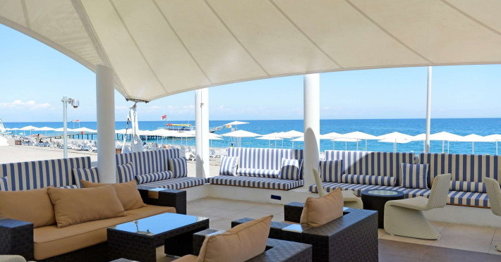 Club Med Palmiye are în apropiere o plajă cu nisip/pietriș. Pe plajă există șezlonguri și umbrele de plajă.
