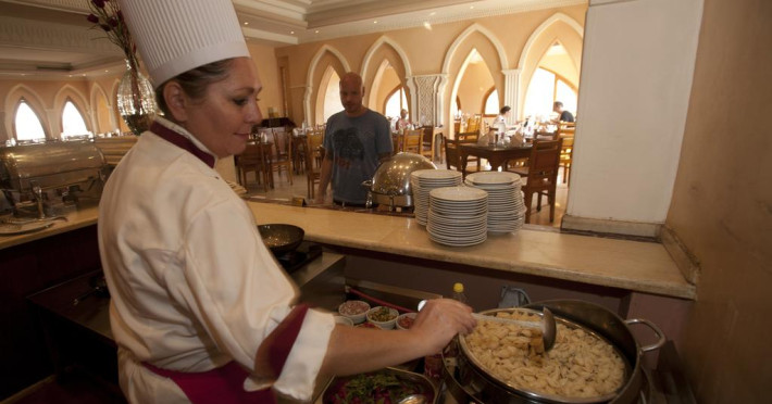 La Club Reef oaspeții au la dispoziție 2 restaurante unde pot savura mâncăruri delicioase, în stil bufet sau à la carte. Preparate din bucătăria internațională și mediteraneană așteaptă să fie degustate în fiecare zi la micul dejun, prânz și cină. Masa poate fi servită atât în interior, cît si în aer liber, pe terasă, în funcție de vreme. 3 baruri, dintre care unul la piscină, sunt disponibile cu o ofertă variată de băuturi răcoritoare și alcoolice. În cadrul proprietății există și un snack bar care servește băuturi și gustări.