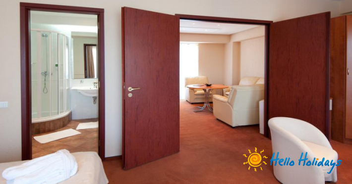 Junior suite, ofera spatiu generos, sunt compuse din dormitor king si living. Ofera vedere catre zona SPA si intrarea in hotel, internet, minibar, senzori de fum, telefon, sonorizare in baie, uscator de par, TV, sistem de inchidere electronica pe baza de cartela, seif si sistem modern de climatizare.