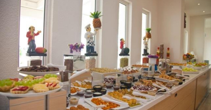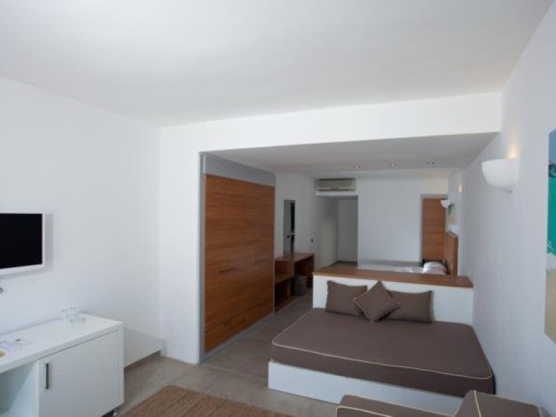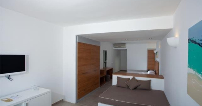 Dotari camere: camerele hotelului sunt spatioase, modern decorate si ofera vedere la mare sau la gradina. Hotelul dispune de 20 camere economic (in cladirea principala, cu vedere la gradina, max 2 persoane), 58 camere standard (cu vedere la mare, maximum 2+1, 3), 77 camere family standard (open plan, fara usa despartitoare, cu vedere la mare, au pat matrimonial, pat extensibil si sofa, maximum 4 persoane), 6 camere family superior (cu vedere la mare si 2 dormitoare separate cu usa, unul are pat matrimonial iar celalalt 2 paturi twin, dispun de balcon propriu si sofa) si 3 suite (decorate in spiritul arhitectonic local, terasa spectaculoasa cu vedere la mare, dispun de 2 dormitoare si living cu sofa, gratuit articole de baie, lumanari parfumate, mini bar si facilitati ceai / cafea).