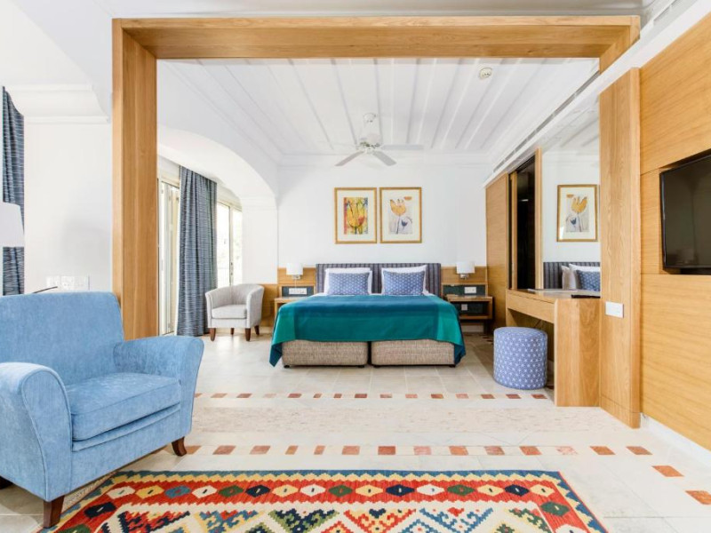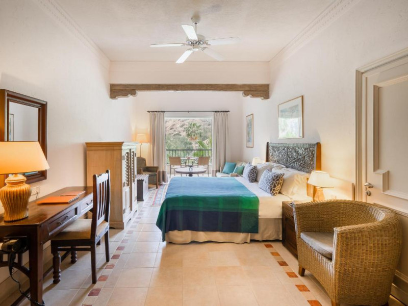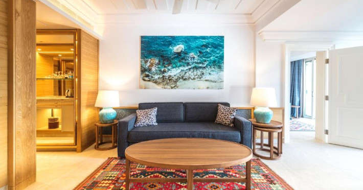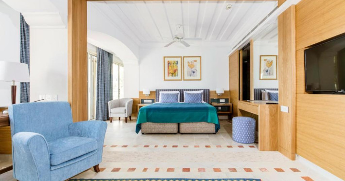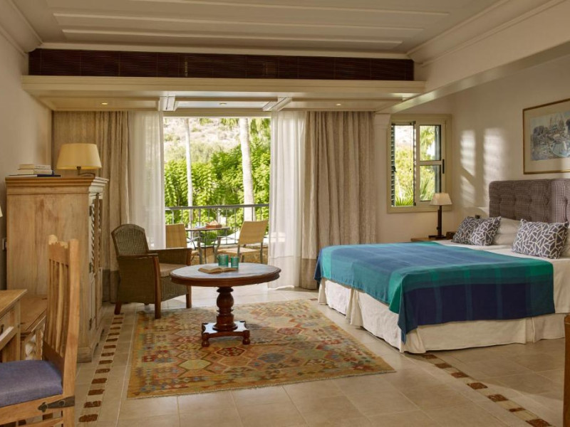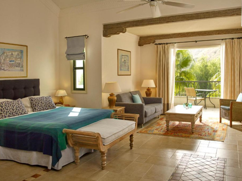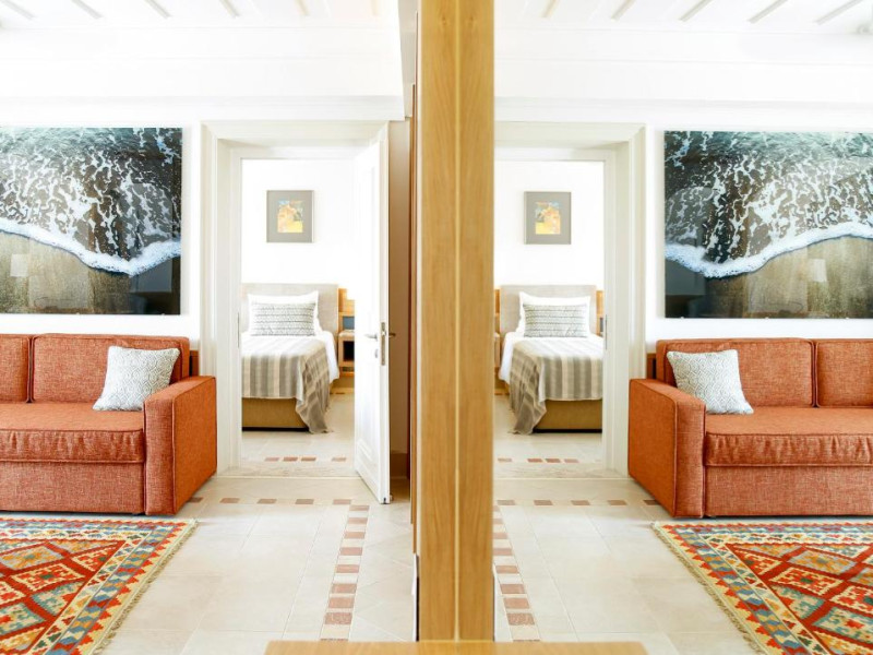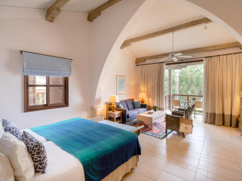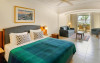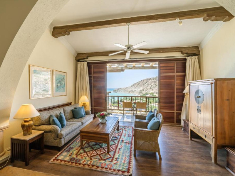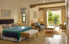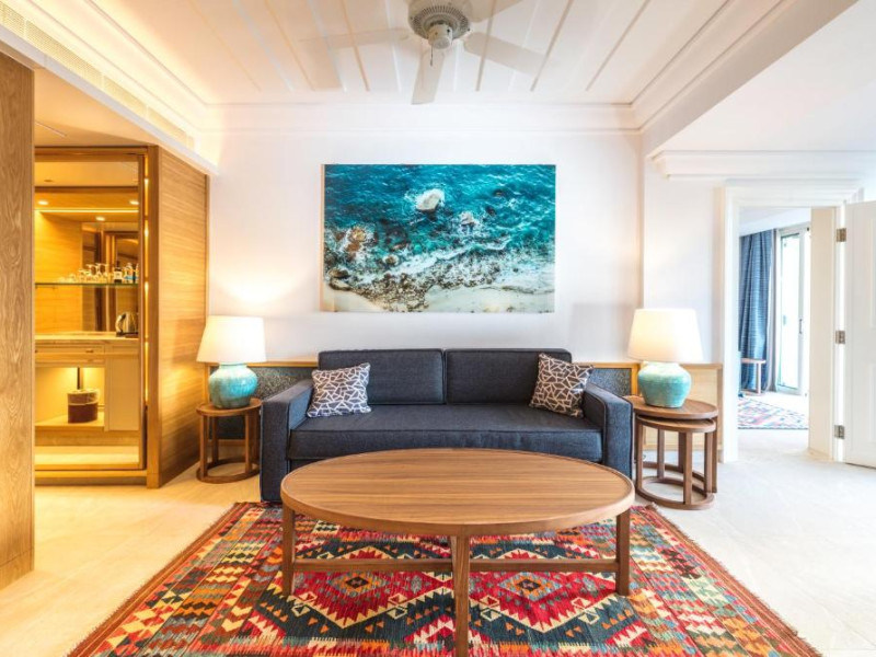 All suites have stone floors, natural wood furnishings and shutters, and overhead ceiling fans to keep them cool. Each has a balcony with views of the gardens or the sea. Facilities include Nespresso coffee makers, Molton Brown toiletries, bathrobes and slippers.