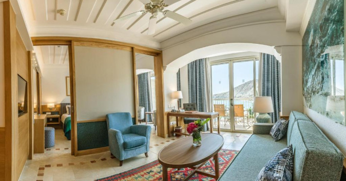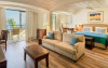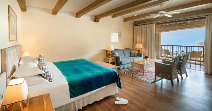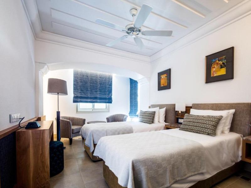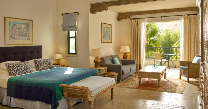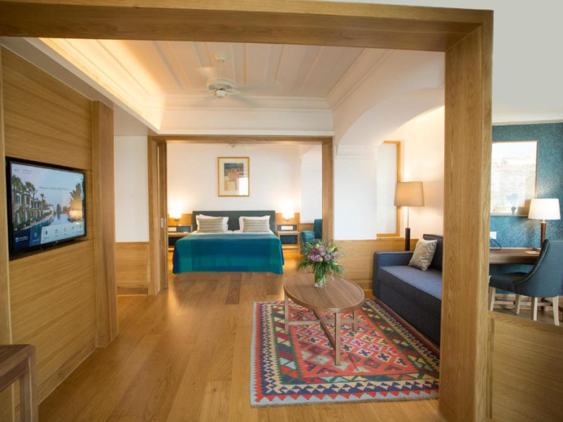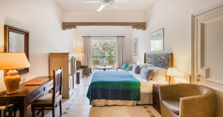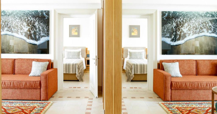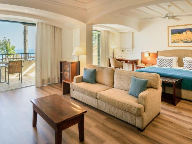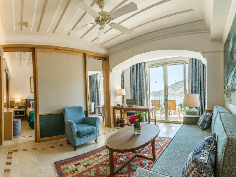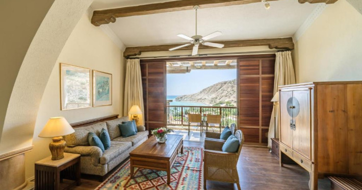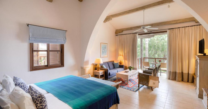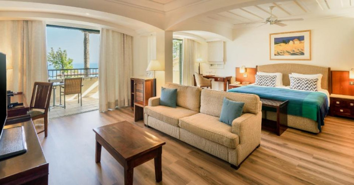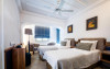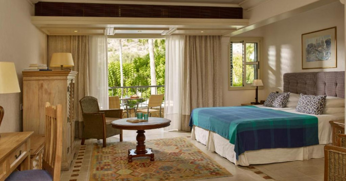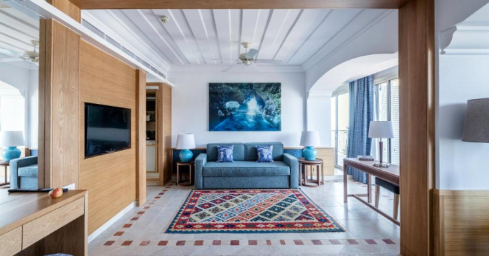 All suites have stone floors, natural wood furnishings and shutters, and overhead ceiling fans to keep them cool. Each has a balcony with views of the gardens or the sea. Facilities include Nespresso coffee makers, Molton Brown toiletries, bathrobes and slippers.