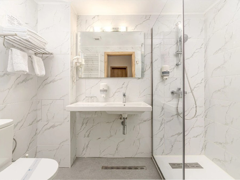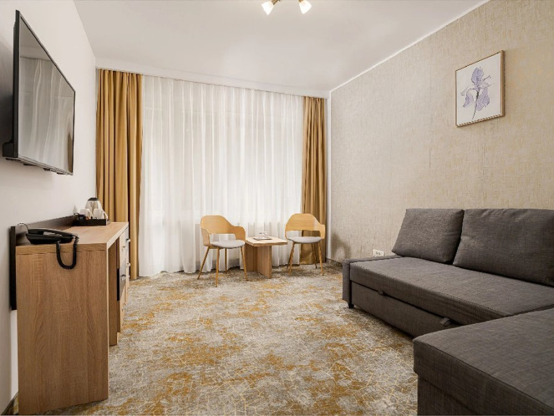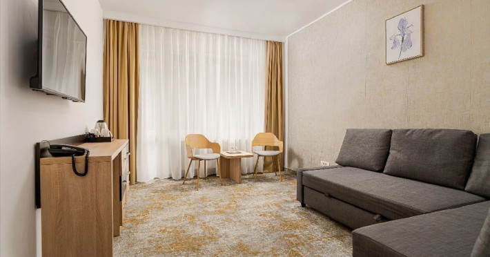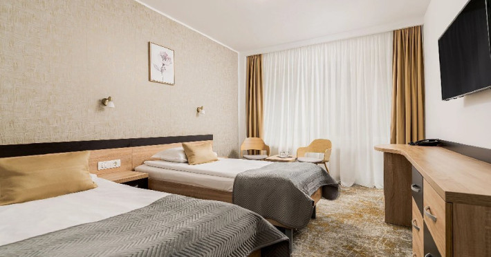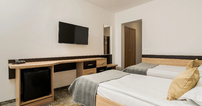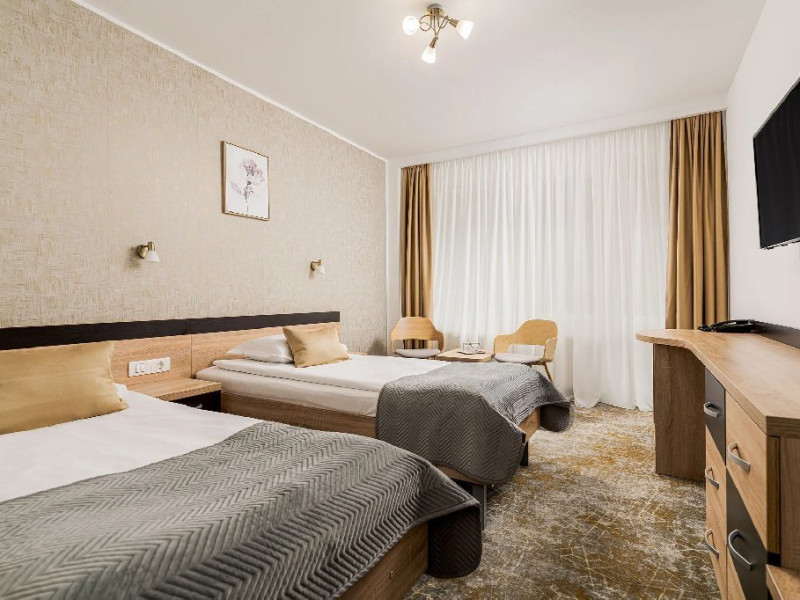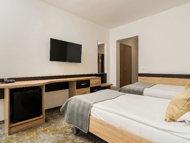 Camerele superioare din Corp Caciulata, renovate complet in 2023, au un design elegant si dotari moderne: doua paturi twin sau un pat matrimonial, TV LCD Full HD, minibar, mobilier modern, baie proprie cu dus, uscator de par.