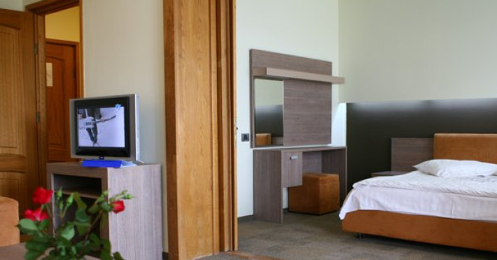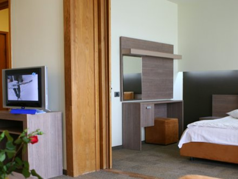 Hotelul dispune si de 6 camere, cu pat matrimonial, dotate cu baie cu cada, televizor, telefon, radio, minibar, dispuse pe doua etaje.