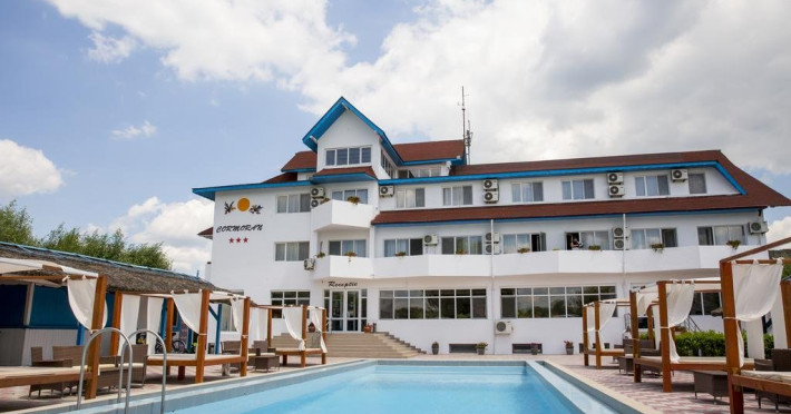 - Hotelul Cormoran are o capacitate de 34 camere duble si 2 garsoniere cu jacuzzi; camerele sunt dotate cu aer conditionat, dus/wc propriu, telefon international, Tv satelit.