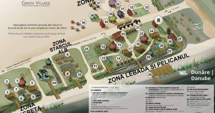 Localizat in Sfantu Gheorghe, locul unde Dunarea intalneste Marea Neagra, Complexul Green Village inseamna deopotriva o vacanta pe litoral si o evadare in inima Deltei. Va recomandam calduros excursiile pe canalele si lacurile din acesta zona unica in Europa.