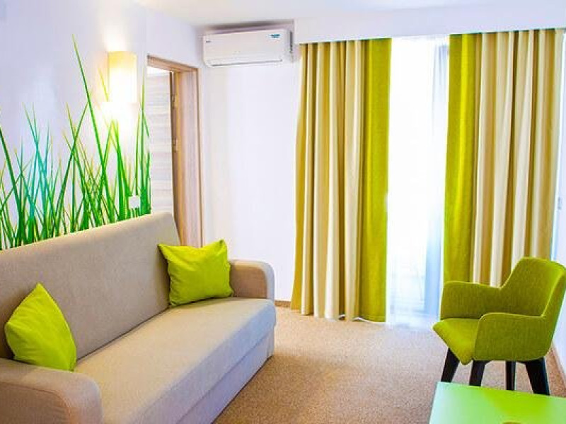 Apartamentul Junior Suite este compus dintr-o camera de zi, cu canapea extensibila, si un dormitor cu pat matrimonial, avand o suprafata de 28,44 mp. Fiecare camera dispune de baie proprie si balcon.
