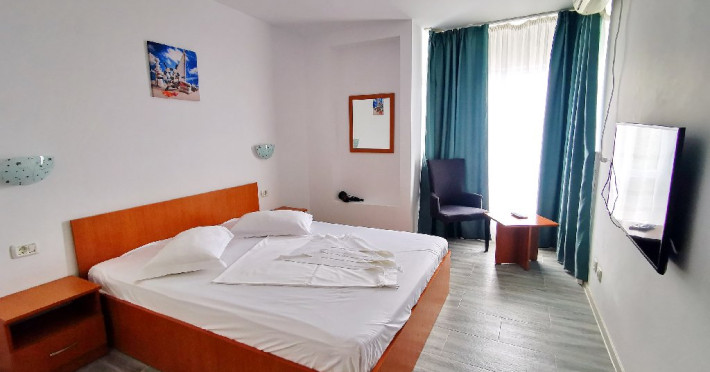 In camera dubla nu se cazeaza mai mult de 2 adulti si 1 copil pana in 12 ani (sau peste 12 cu pat suplimentar). Hotelul nu are nici o camera cu balcon!!Toate spatiile de cazare au fost complet renovate recent, inclusiv baile.Camerele duble din incinta Hotelului Pam Beach Olimp sunt dotate cu televizor cu ecran plat si televiziune prin cablu, mini frigider, internet wireless, aer conditionat, telefon,uscator de haine, uscator de par, mocheta, baie cu dus, renovata si dotata cu produse de toaleta. Pot avea fie pat matrimonial, fie doua paturi. Suprafara 18 mp.
