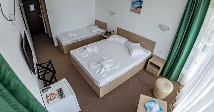 Camera tripla are aceleasi dotari ca si camera dubla, dar include pat matrimonial pentru 2 persoane si 1 pat individual pentru a 3-a persoana. Suprafata 22 mp.
