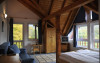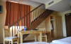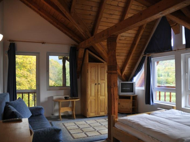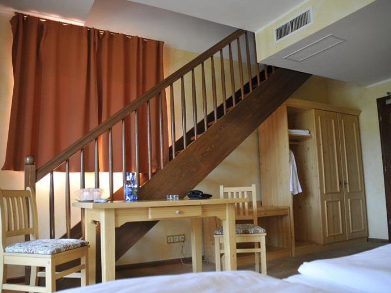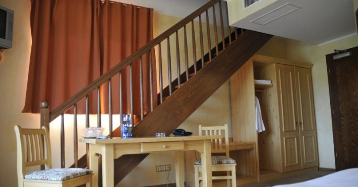 Junior suite sunt spatii de cazare dispuse pe doua nivele, la parter avem pat matrimonial, tv, acces terasa, masuta si scaune, baie cu cabina de dus, la etaj se ajunge pe o scara interioara si se afla un dormitor cu doua paturi.