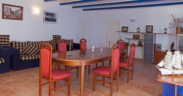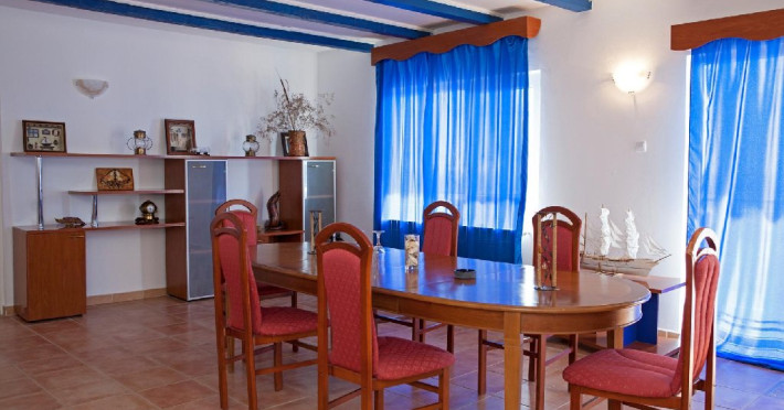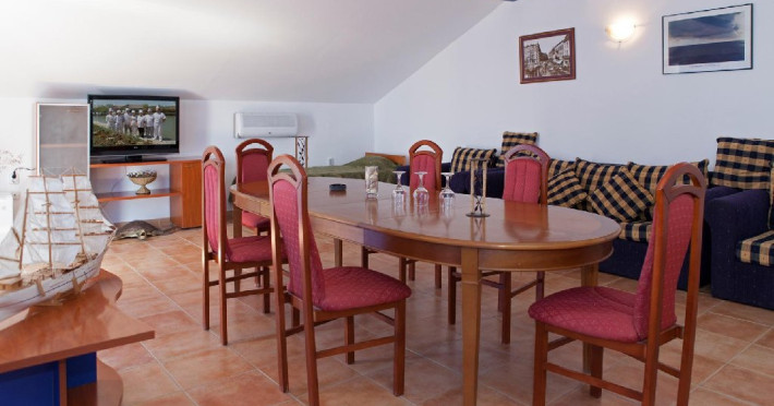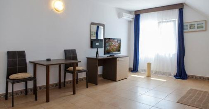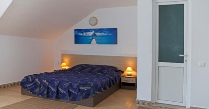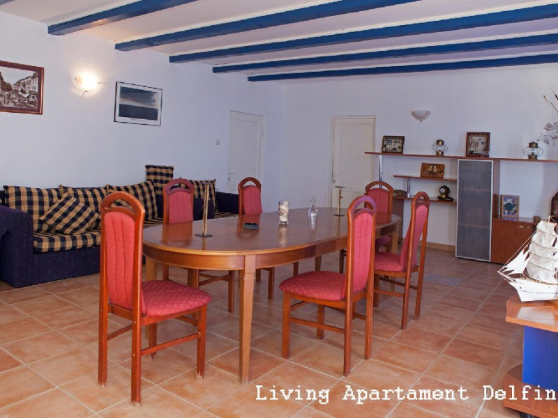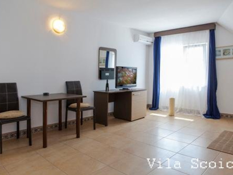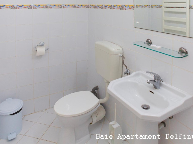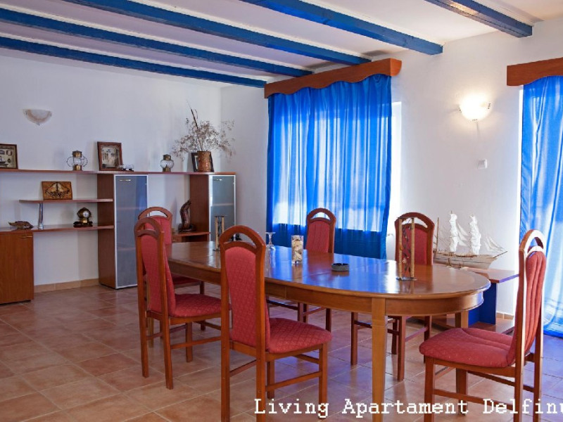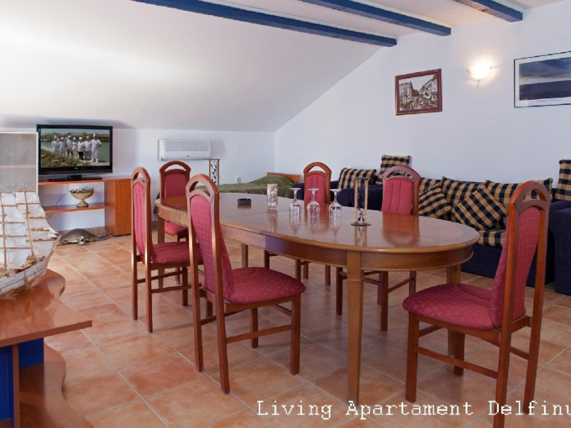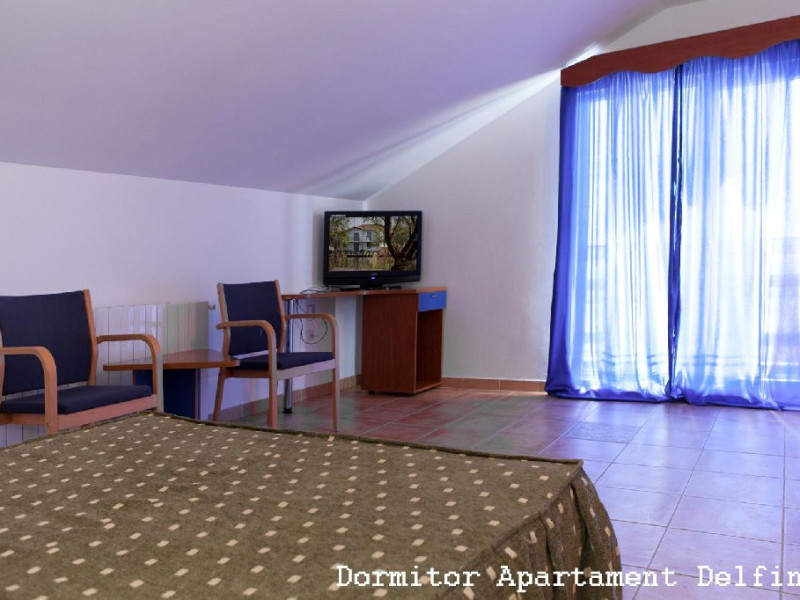 Un apartament situat la etajul 2 al vilei Delfinul, cu vedere la mare, suprafata de aprox. 60 mp, compus din living spatios cu canapea extensibila, masa cu 10 scaune, fotolii si dormitor cu pat matrimonial, dotat cu: aer conditionat, LCD, minifrigider, internet wireless