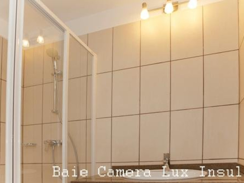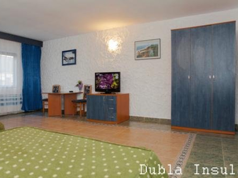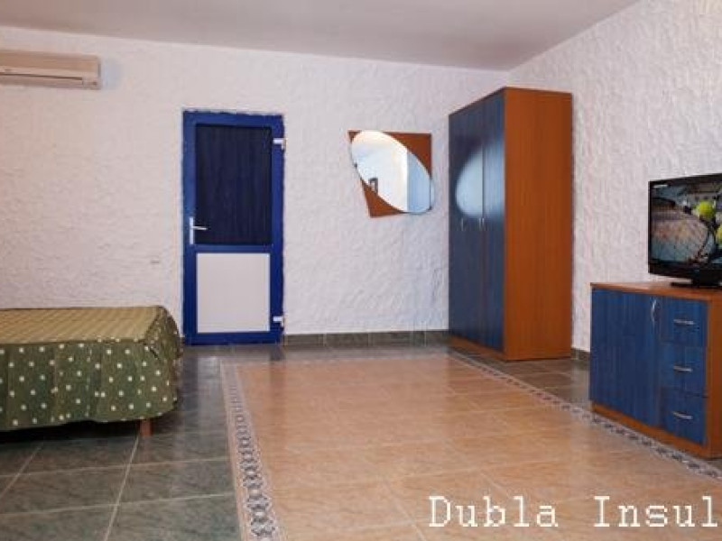 Camera dubla cu terasa catre canal principal, complet modernizata cu terasa proprie deschisa, mobiler nou din lemn masiv, pat matrimonial, aer conditionat, televizor LCD, minifrigider, internet wireless, baie moderna (cabina dus, uscator de par, bideu, chiuveta cu blat din granit).