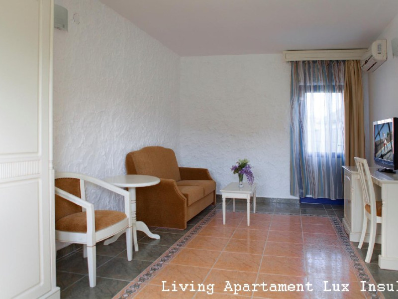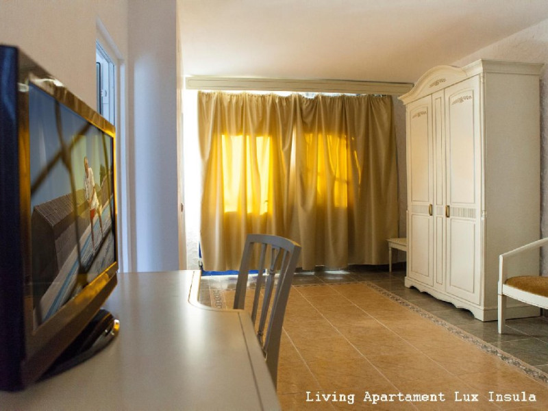 Apartamentele sunt compuse dintr-un dormitor cu pat matrimonial si un living cu canapea extensibila. Mobilier nou din lemn masiv, televizor LCD in dormitor si inliving, baile complet renovate (cabina dus, uscator de par, bideu, chiuveta cublat din granit).