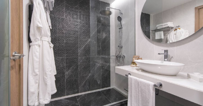 - 22 family room (vedere la mare, tip I: trei camere - living, 2 dormitoare (un dormitor cu pat king size si usa, al doilea despartit prin perete, cu twin bed), 2 bai: o baie cu dus, cealalta cu cada, 2 TV, max. 3+2 pers., 55 - 82 m2; tip II: 2 nivele - la primul nivel: living cu 2 canapele, TV, baie; la al doilea nivel: dormitor fara usa, french bed, baie cu dus, max. 4 pers., 47 m2);