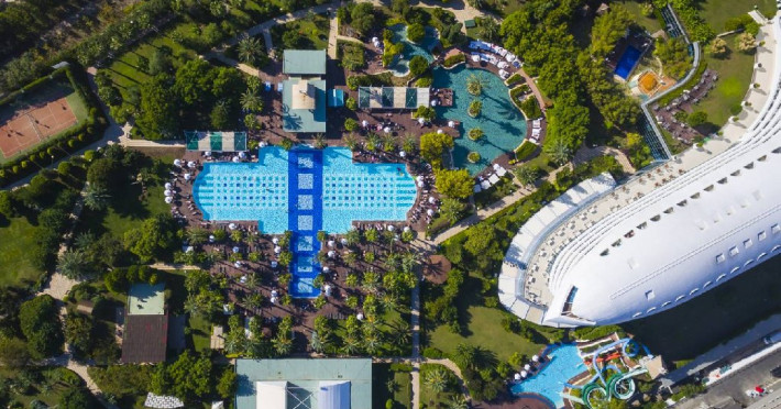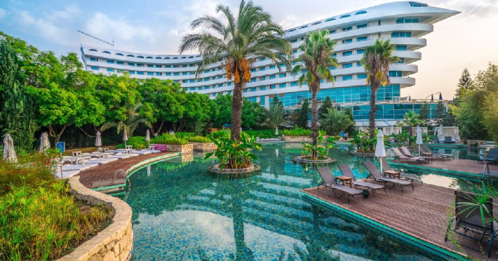Facilitati hotel: Restaurant principal are atat un meniu dietetic cat si unul vegetarian, 6 restaurante a la carte (japonez/chinezesc, italian, turcesc, pescaresc, steak house, barbeque, pentru care se achita o taxa de rezervare). De asemenea, resortul dispune de 8 baruri (1 bar deschis nonstop) 3 piscine exterioare si piscina interioara (cu incalzire pe timp de iarna) si 4 tobogane acvatice. Coafor, magazine, spalatorie si 5 sali de conferinte (cu capacitate de 50 -1100 pers.), cabinet medical centru SPA internet cafe (grauit) internet WiFi (in lobby, gratuit).Programe de divertisment in timpul zilei si spectacole seara, seri cu tematica in fiecare saptamana, Gala Dinners la fiecare 14 zile, muzica live. Mini club Dombo pentru copii cu varste cuprinse intre 4 si 12 ani.