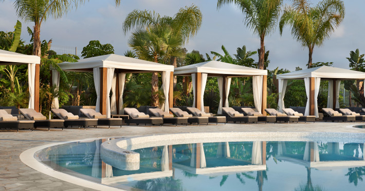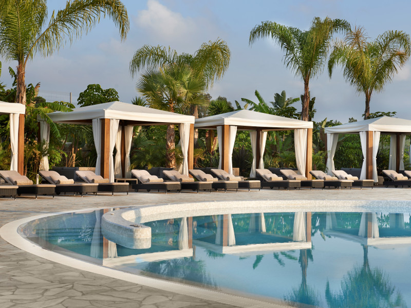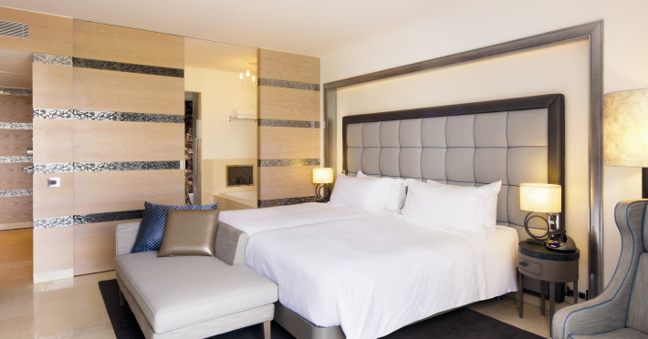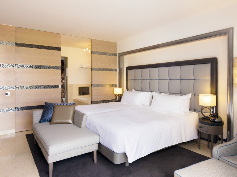 Guestrooms and suites are spread over six floors decorated in natural tones and opened out onto furnished balconies. Marble bathrooms, with rain showers, are fitted with inbuilt television.