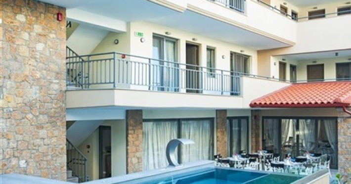Situat pe peninsula Kassandra, in centrul statiunii Polichrono,in apropiere de zona comerciala, la 120m de mare si la cca 95km de Salonic.