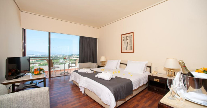Sunt disponibile 264 camere. Unele camere au balcon cu vedere la mare sau la grădină. Camerele luminoase de la Corfu Holiday Palace sunt dotate cu gresie sau parchet, aer condiționat, Tv și seif. În camere există baie cu cadă sau duș ce are în dotare foehn și articole de toaletă gratuite. Fiecare cameră dispune de minibar și cană-fierbător. Oaspeții pot solicita serviciul de room service pentru a servi masa sau diverse băuturi. Oaspeții au acces gratuit la serviciul Wi-fi în camere. Curățenia in cameră se face zilnic. Anumite camere au zonă de relaxare cu canapea și cadă cu hidromasaj care asigură un plus de confort și răsfăț. Proprietatea oferă camere pentru familie cu o suprafață mai mare și un număr mai mare de paturi față de cele standard.