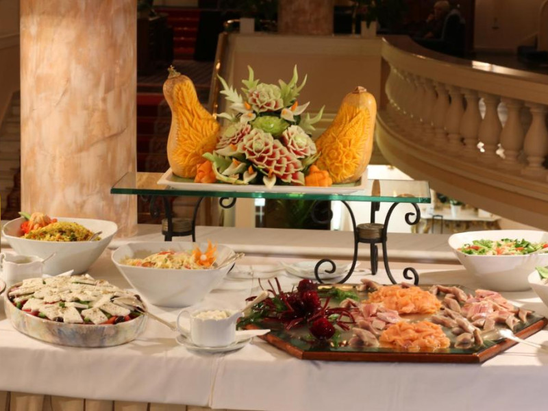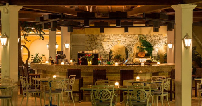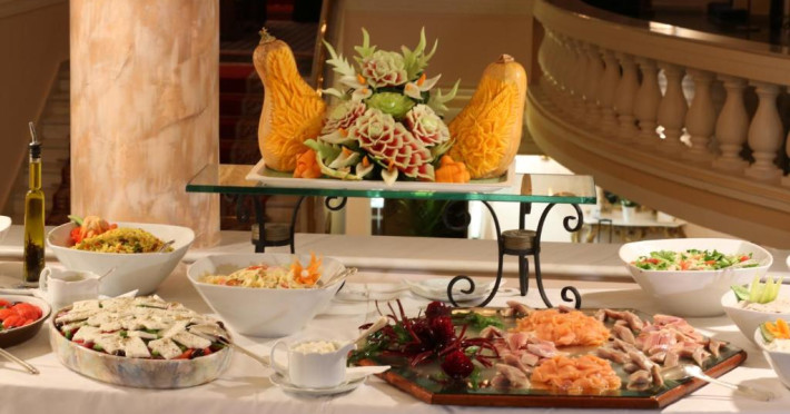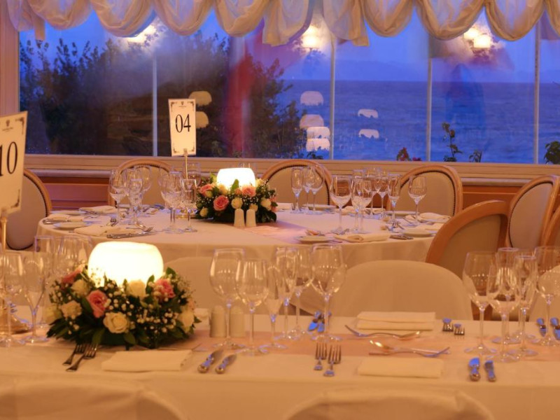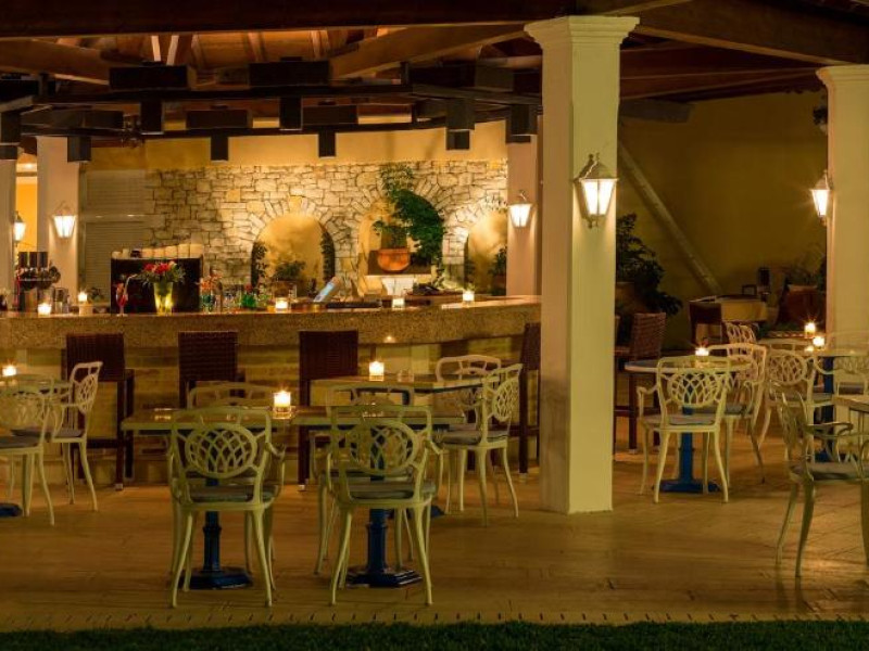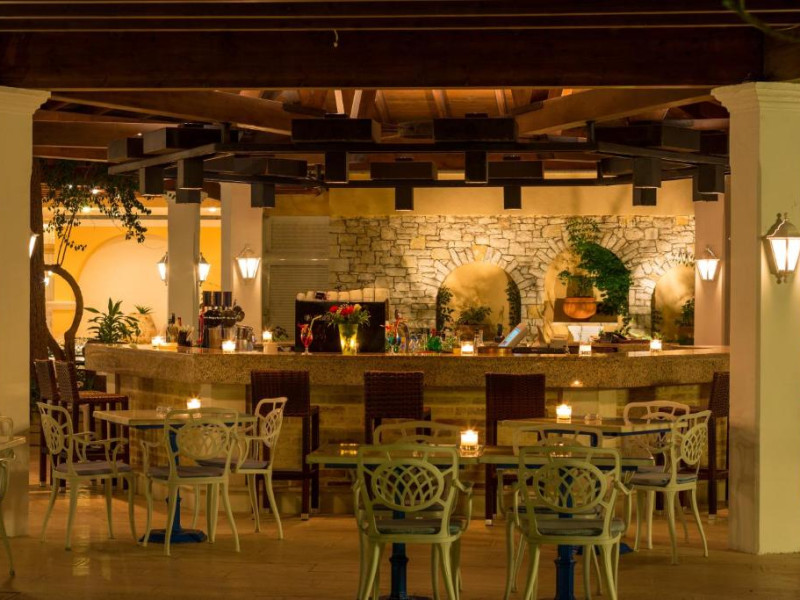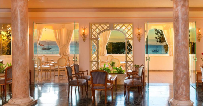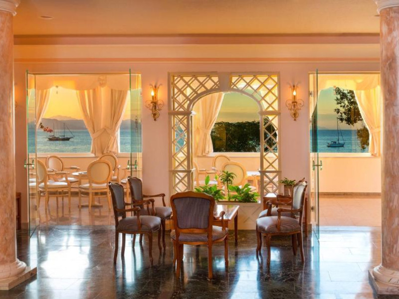 Un mic dejun tip bufet bogat este servit la restaurantul principal, mobilat cu scaune in stil Ludovic al XV-lea. Restaurantul a lacarte Scheria oferă meniuri internaționale. Oaspeții pot savura o băutură la unul dintre cele 2 baruri interioare sau la barul Café Del Mare de langă piscină.