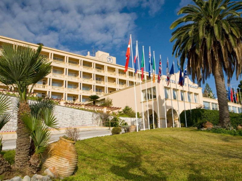 Hotelul Corfu Palace oferă camere cu baie de marmură și balcon sau terasă privată. Facilitățile camerei includ aer condiționat, TV prin satelit și uscător de păr. Este disponibil room service nonstop.