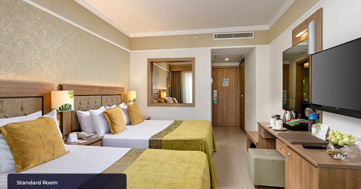Camera dubla standard cu balcon mare sau balcon mic ( stil frantuzesc) dispun de pat matrimonial (160x220 cm) sau paturi twin (doua paturi single care se pot apropia), de baie proprie, uscator de par, geam termopan cu plasa pentru insecte, fotolii si masuta, aer conditionat, TV, frigobar, telefon pentru apeluri in hotel si balcon mare cu masuta si scaune sau balcon mic in stil frantuzesc. Camerele au vedere spre gradina cu foisoare, sunt orientate spre sudul statiunii Venus si sunt situate la etajele 2 si 3.