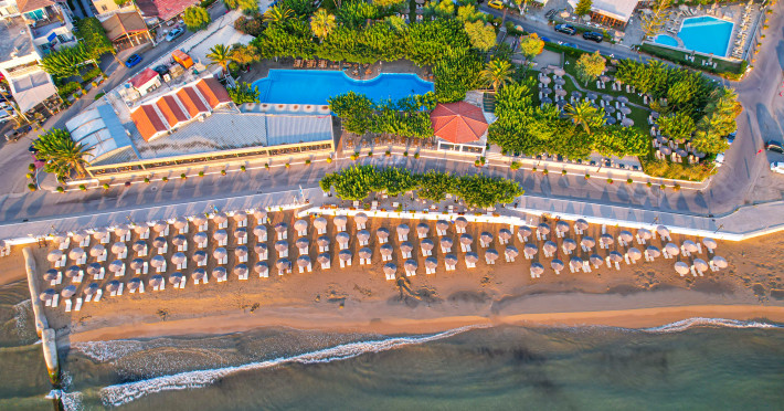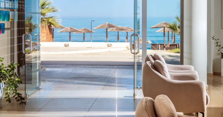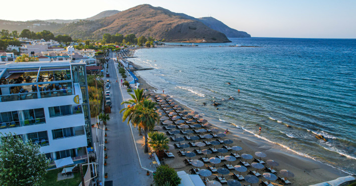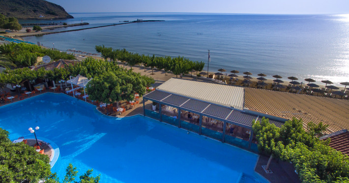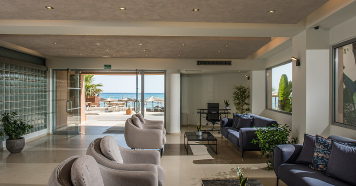 The newly renovated midscale hotel is set in a quiet, but central location, directly next the longest sandy beach and only a short stroll from the delightful town square of Georgioupolis on the island of Crete in Greece. Not far away are the towns of Chania and Rethymno. Georgioupolis is located about 35 km east of Chania and about 22 km west of Rethymno: a very quiet but central location in Crete, ideal for holidaymakers who also like to explore the island.