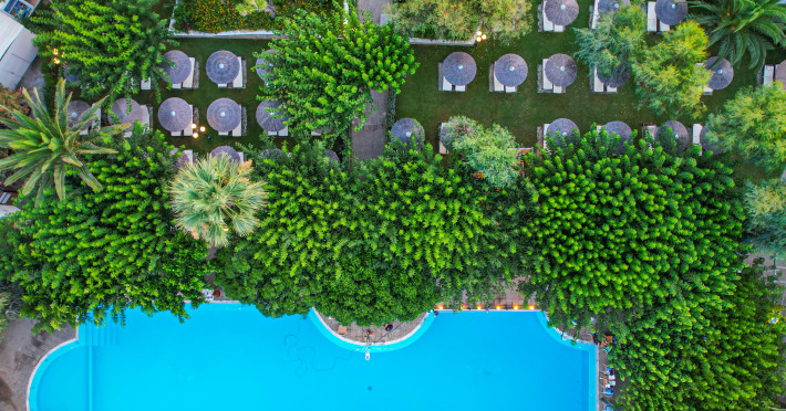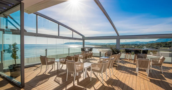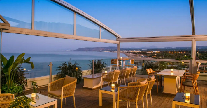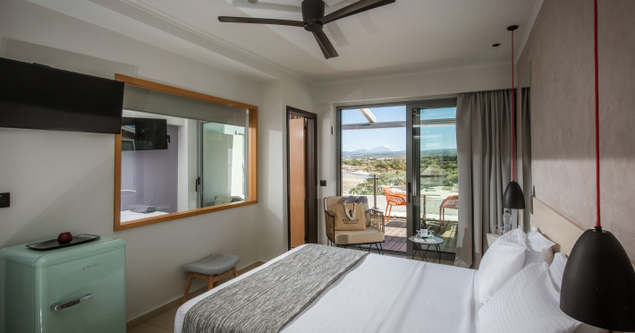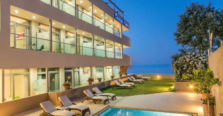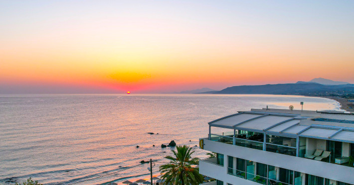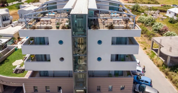 The exterior glass lift will transport guests to a unique lounge café and cocktail bar on the rooftop terrace of the Corissia Princess Hotel, offering unparalleled 360° views of the Georgioupolis bay. The lounge provides a romantic and relaxing atmosphere where guests can enjoy a wide selection of cocktails, coffees, and refreshing drinks. The buffet restaurant in Corissia Park, conveniently located adjacent to the beach, offers a freshly prepared breakfast with live cooking stations. The hotel restaurant boasts a unique location with a stunning view of the beach. In a specially equipped, spacious area, guests can enjoy a range of cosmetic and massage treatments, tailored to their individual needs, with the assistance of our highly trained staff. A variety of massage treatments are available to help guests relax and recharge, providing rest and well-being for the body and mind. The hotel offers an exquisite selection of wines, delicious cocktails and spirits, as well as coffees and refreshing drinks of all kinds. Guests may relax by the large swimming pool on sun beds on the lawn, under the shade of an umbrella or palm tree, or on the sandy beach. In the evening, the hotel offers the same tempting range of cocktails and drinks as well as special culinary creations of the chef in the à la carte restaurant, Armonia. The Portokali Beach Bar is conveniently located on the beach across the hotel entrance, offering a great selection of drinks and casual food options. The hotel has its own private pool on the first floor of the hotel. Guests can also have access to the pool facilities at Corissia Park. The Corissia Princess Hotel has a total of 69 rooms and suites distributed over 4 floors.