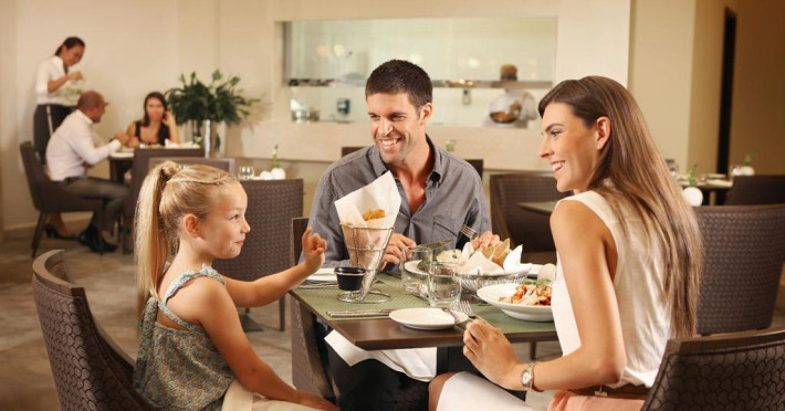 La Cosmopolitan oaspeții au la dispoziție un restaurant care servește mâncare în stil bufet și à la carte. Preparate din bucătăria internațională așteaptă să fie degustate în fiecare zi la micul dejun, prânz și cină. Masa poate fi servită atât în interior, cît si în aer liber, pe terasă, în funcție de vreme. Oaspeţii pot avea diverse băuturi răcoritoare sau alcoolice la bar. De asemenea , în cadrul proprietății, există cafenea și snack bar ideale pentru o gustare rapidă.