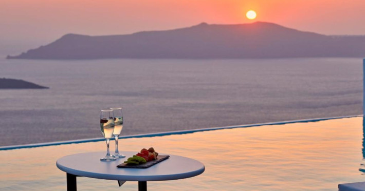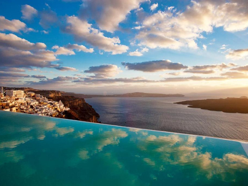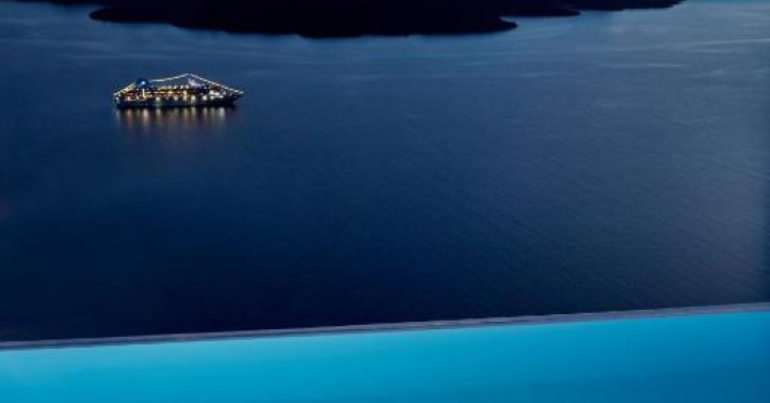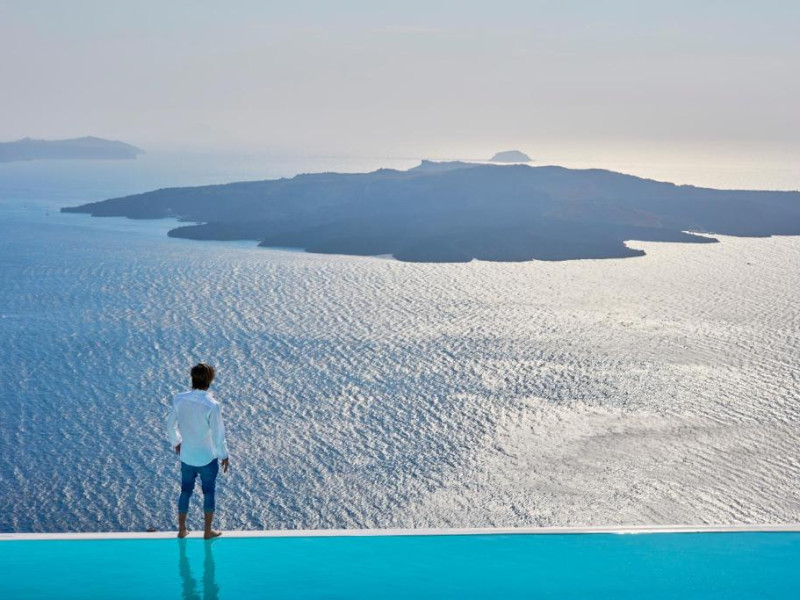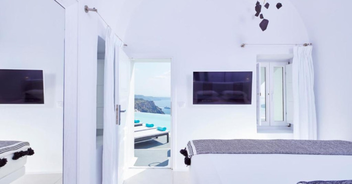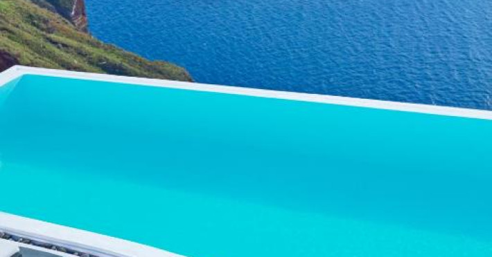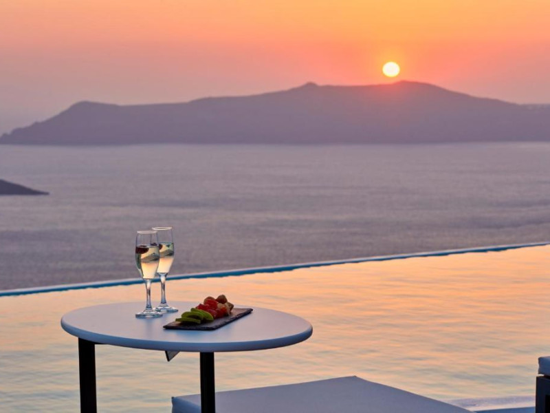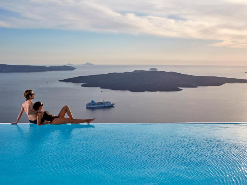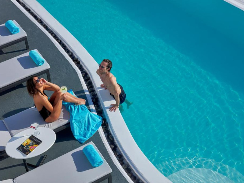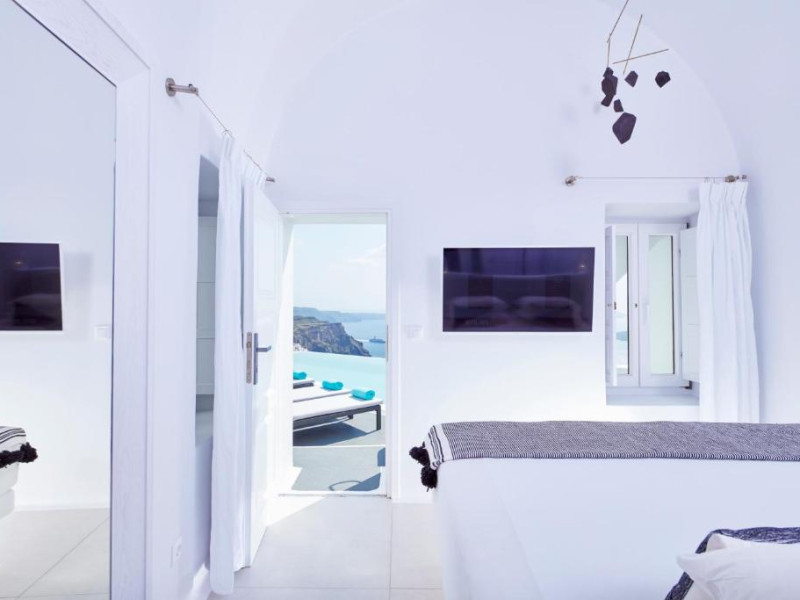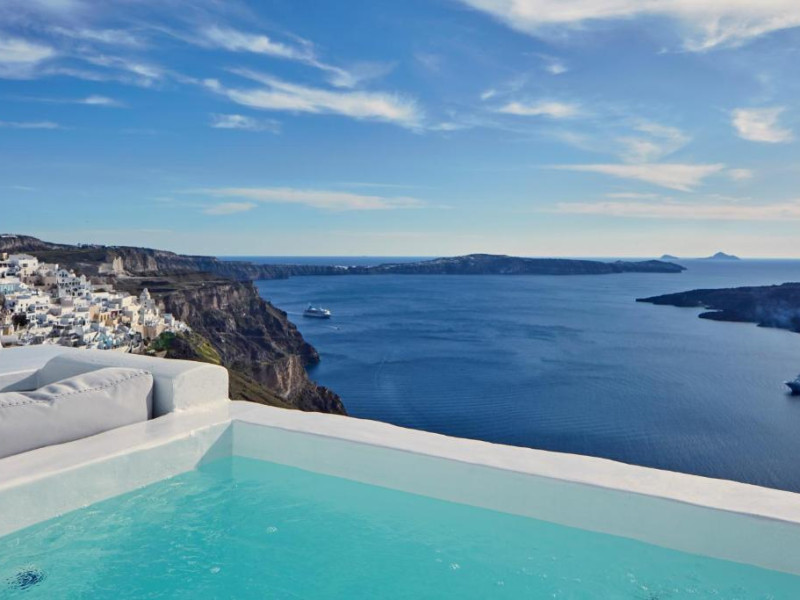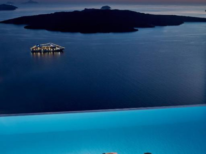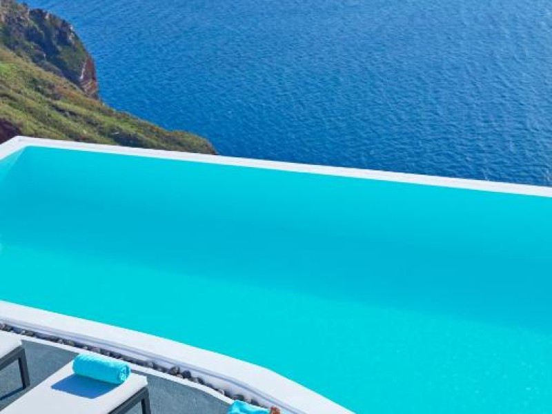 Cosmopolitan Suites are o piscină infinită suspendată de stancă si o terasă pentru plajă, cu vedere impresionantă la caldeiră si la vulcan.