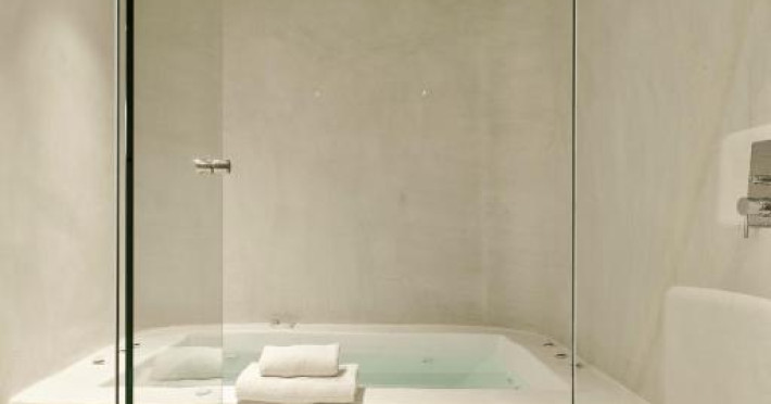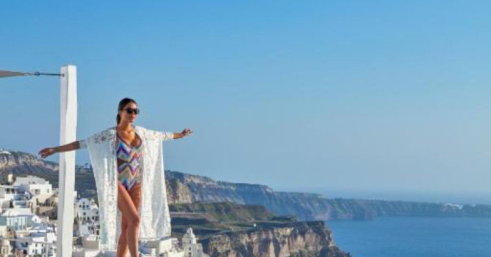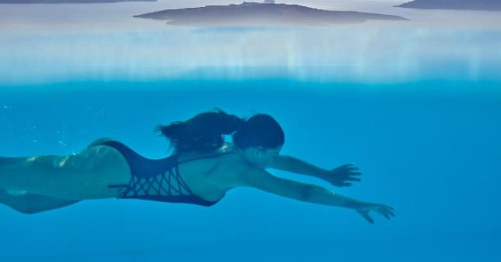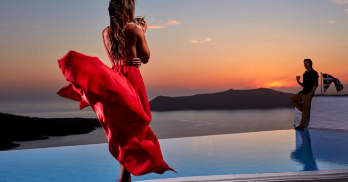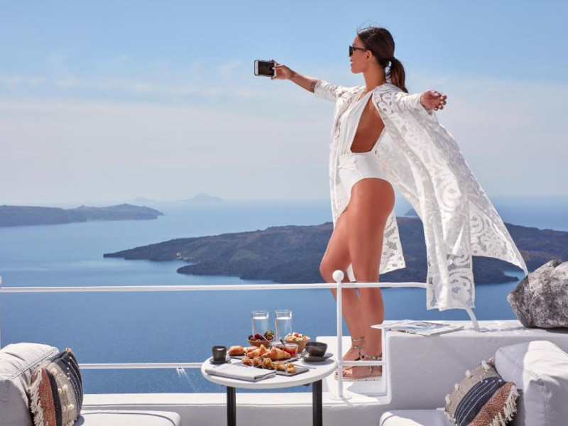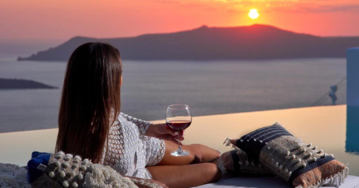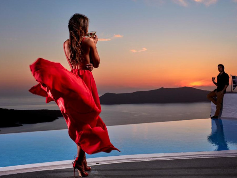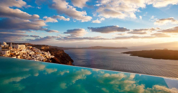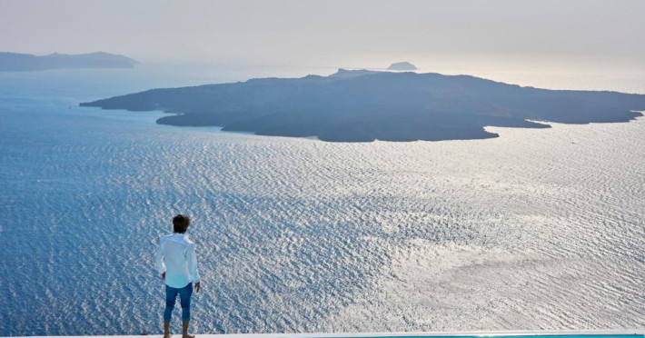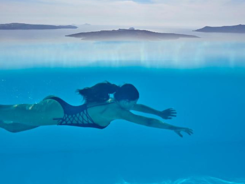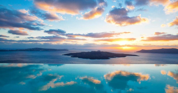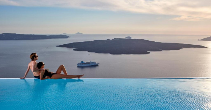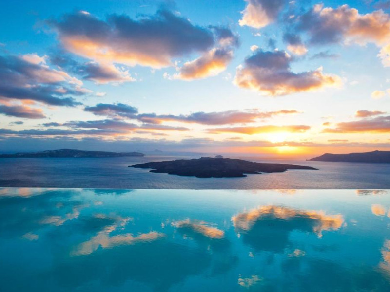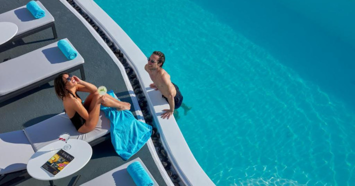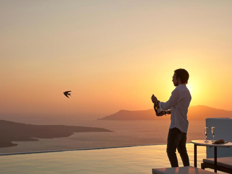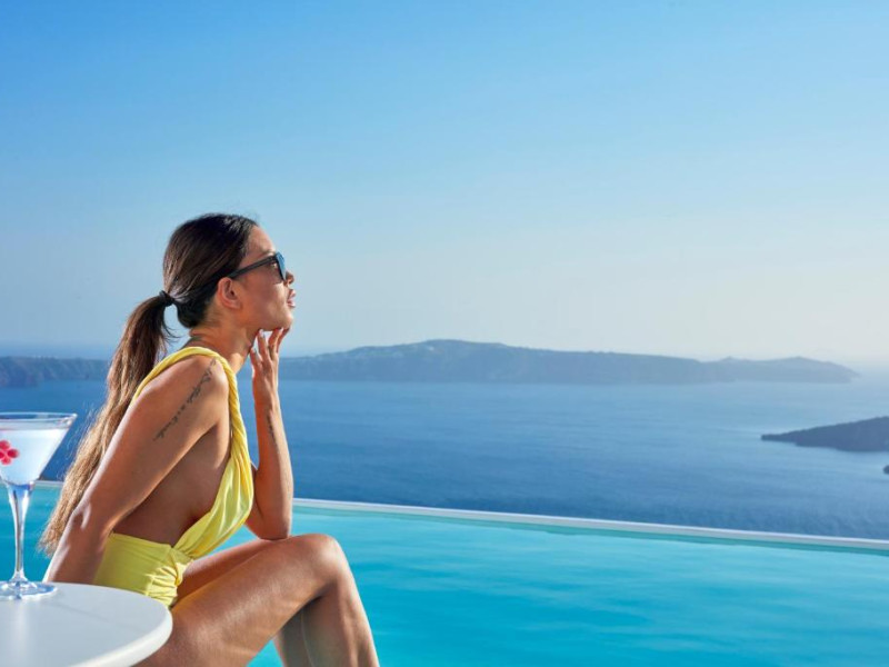 Cosmopolitan Suites are o piscină infinită suspendată de stancă si o terasă pentru plajă, cu vedere impresionantă la caldeiră si la vulcan.