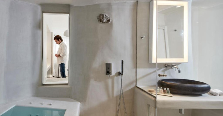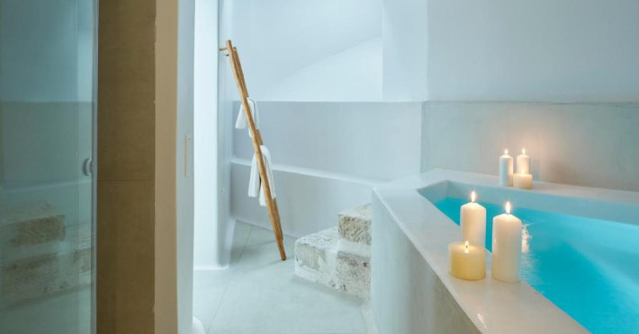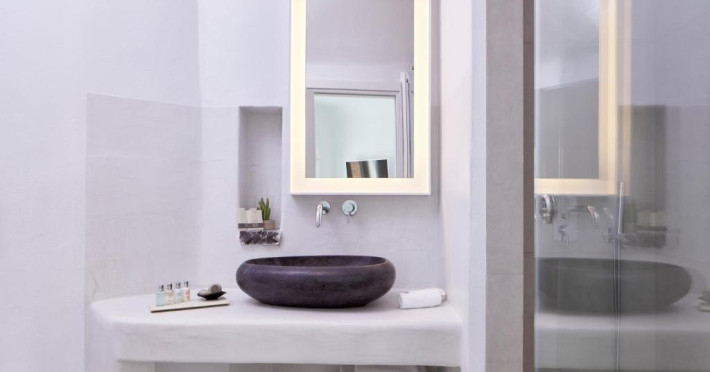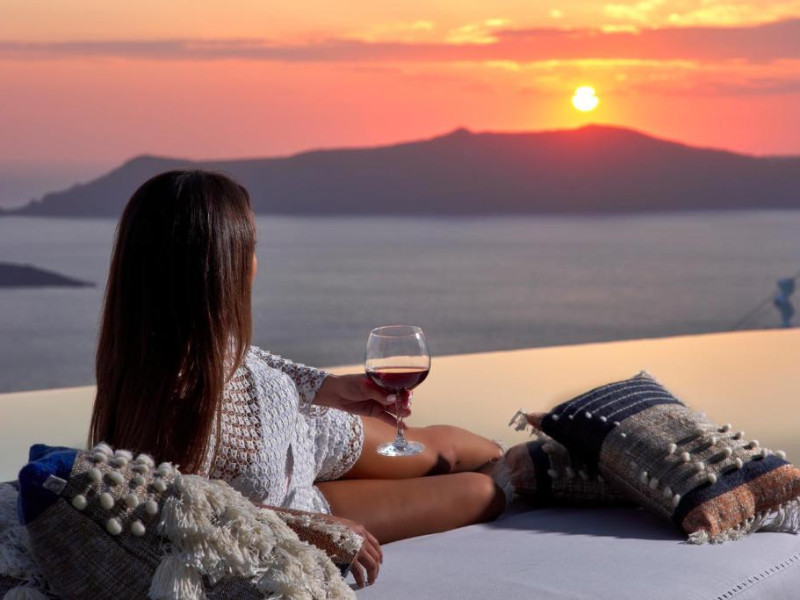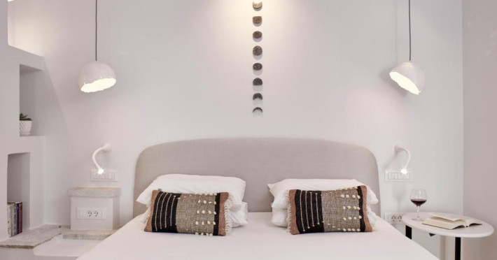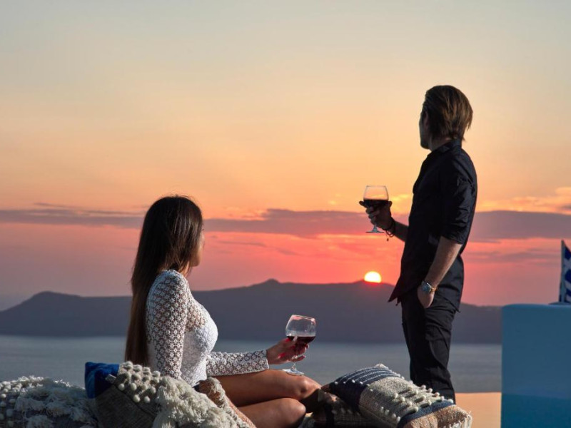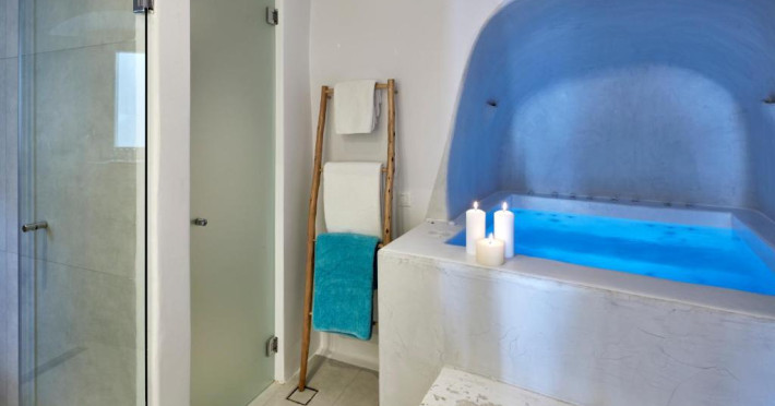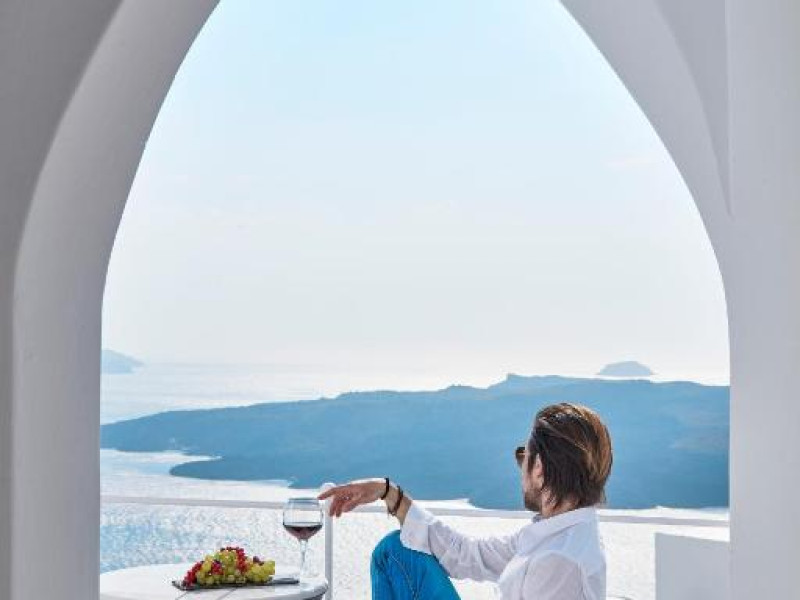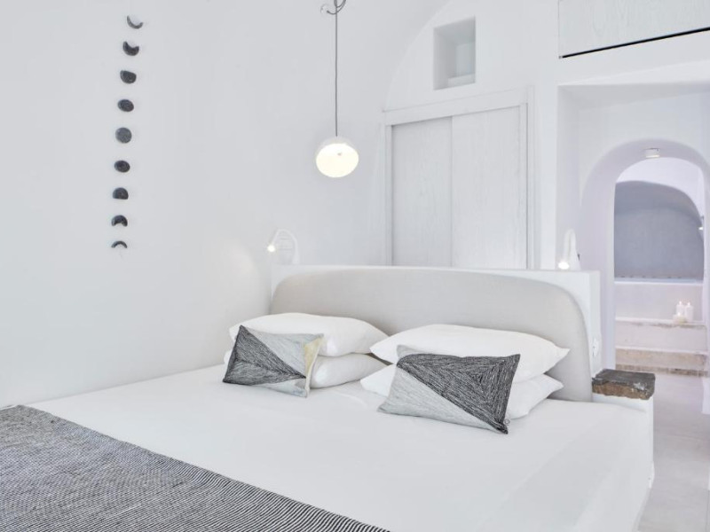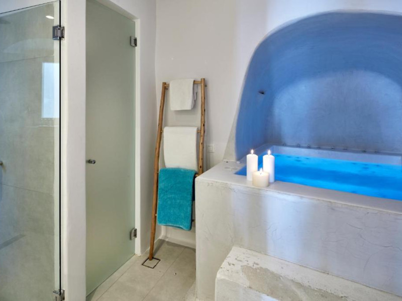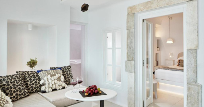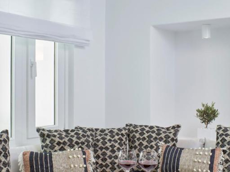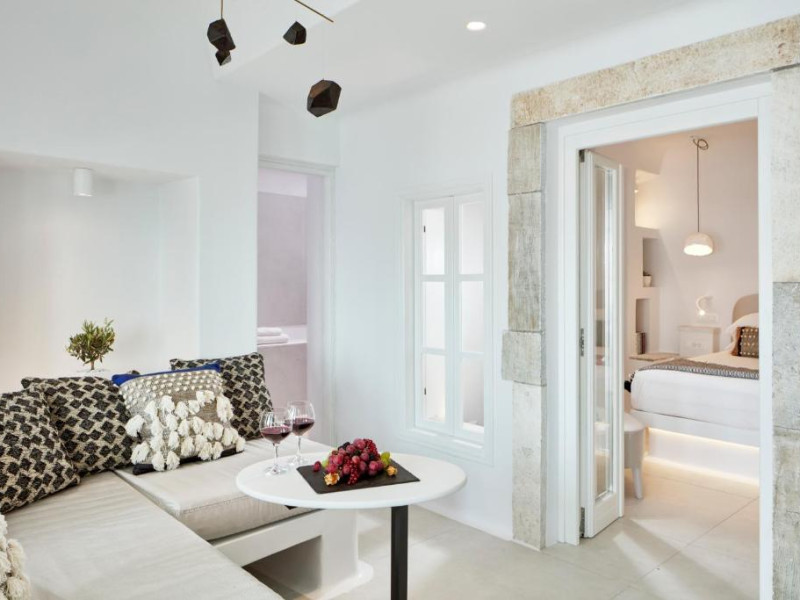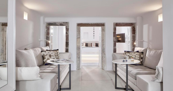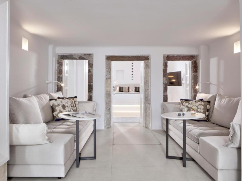 Cosmopolitan Suites oferă 10 unităti distincte amenajate elegant, in stilul insulei Santorini, cu verandă sau balcon privat sau semi-privat cu vedere la mare si la vulcan.