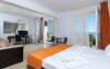 Dubla superior cu vedere la mare: 2 paturi twin si de o canapea extensibila. Camera de aproximativ 28 mp, AC, TV, frigider, wifi, baie proprie, 2 balcoane, masa si scaune pentru balcon. Camerele au vedere la mare. Maxim 2 adulti + 2 copii pana in 18 ani.
