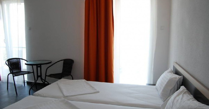 Dubla cu balcon(vedere in curtea interioara): 2 paturi twin, suprafata 14 m2, balcon cu masa si scaune, baie proprie cu cadita de dus, AC, TV, frigider, wifi. Maxim 2 persoane.