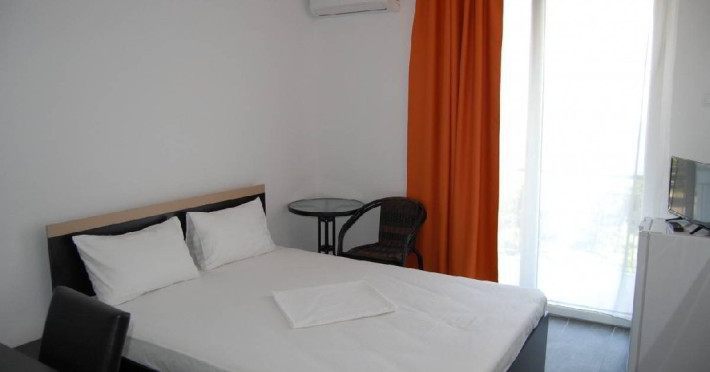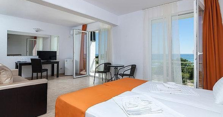 Apartamentul Standard: 1 dormitor cu pat matrimonial, living cu canapea extensibila. Camera de aproximativ 28 mp, AC, TV, frigider, wifi, baie proprie, 2 balcoane, cu scaune si masa. Vedere laterala la mare. Maxim 2 adulti + 2 copii pana in 18 ani.
