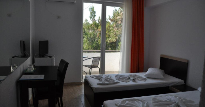 Camera Tripla: dispune de trei paturi single avand in jur de 20 m2. Acest tip de camera nu are balcon dar are aer conditionat, baie proprie cu cadita de dus, televizor; frigider; Wi-fi. Vedere in curtea interioara.