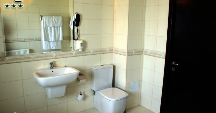 Camerele Duble Deluxe, au mocheta in camera, vedere laterala la mare, pat matrimonial si canapea extensibila si pot acomoda 2 adulti cu 1 copil pana in 10 ani. Baile au dus si cada.
