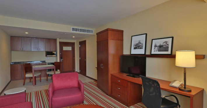 Toate camerele Hotelului Courtyard Panama Real oferă ferestre izolate fonic, cu vedere la oraș. Fiecare cameră include un birou mare, un frigider și un aparat de cafea.
