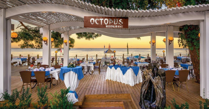 Ultimate All Inclusive -restaurant principal Caretta tip bufet pentru mic dejun, mic dejun tarziu, pranz, gustari dimineata si dupa amiaza, prajituri, ceai si cafea, cina, cina tarzie, toate bauturile locale si unele standard din import alcoolice si non alcoolice, restaurantele A'la Carte cu rezervare in prealabil disponibile o singura data pe sejur (copiii sub 7 ani nu au acces). Nu sunt incluse in concept: bauturile speciale din import, toate bauturile imbuteliate, sucurile de fructe proaspete, bauturile energizante, room service, restaurantul A'la Carte Octopus, bauturile alcoolice din import in intervalul orar 01.00-10.00.
