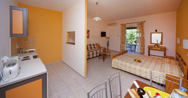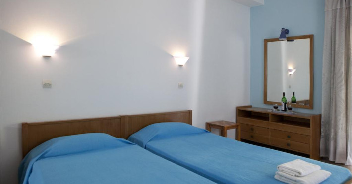 Fiecare cameră dispune de cană pentru prepararea apei calde. Oaspeții pot solicita serviciul de room service pentru a servi masa sau diverse băuturi. În camere există baie cu cadă sau duș prevăzută cu foehn. Camerele confortabile de la Crystal Blue Aparthotel au pardoseală de gresie/ marmură, aer condiționat, Tv cu canale prin satelit și seif. Unele camere au balcon cu vedere la mare sau la piscină. Oaspeții au acces gratuit la serviciul Wi-fi în camere. Curățenia in cameră se face zilnic. Fiecare unitate de cazare include o chicinetă utilată cu frigider, plită de gătit și ustensile de bucătărie. De asemenea, sunt disponibile o zonă de luat masa și un cuptor cu microunde. Proprietatea oferă camere pentru familie cu o suprafață mai mare și un număr mai mare de paturi față de cele standard. Se pot rezerva de asemenea camere pentru nefumători.