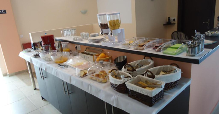 La proprietate există un snack-bar care oferă cafea, băuturi și gustări. Masa poate fi servită atât în interior, cît si în aer liber, pe terasă, în funcție de vreme. Oaspeţii îşi pot pregăti micul dejun şi alte mese şi le pot savura chiar pe balcon. Pentru cei care doresc să ia masa în natură, Crystal Blue Aparthotel pune la dispoziție o zonă de picnic.