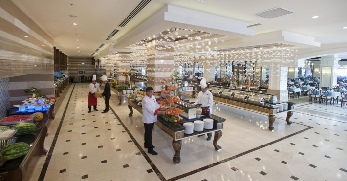 La Crystal Palace Luxury Resort & Spa oaspeții au la dispoziție 6 restaurante unde pot savura mâncăruri delicioase, în stil bufet sau à la carte. Preparate din bucătăria internațională, italiană, precum și preparate pescărești așteaptă să fie degustate în fiecare zi la micul dejun, prânz și cină. Masa poate fi servită atât în interior, cît si în aer liber, pe terasă, în funcție de vreme. 6 baruri, dintre care unul la piscină și unul pe plajă, sunt disponibile cu o ofertă variată de băuturi răcoritoare și alcoolice.