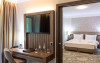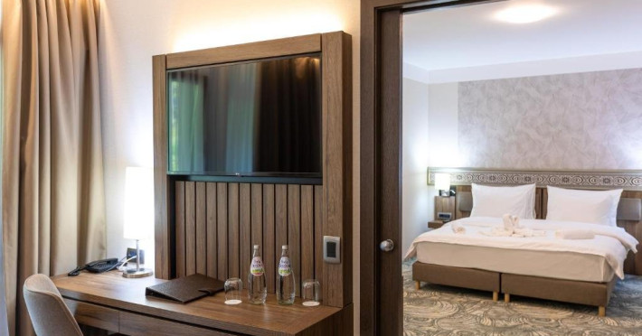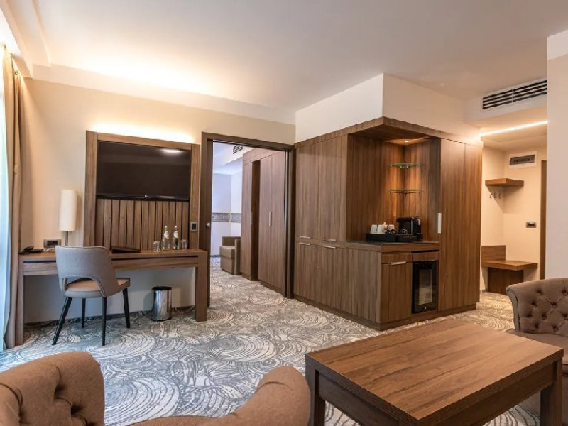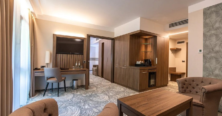 formata dintr-o camera de lux, o baie, living, toate dotate cu facilitati de ultima generatie, mini-bar, linie telefonica direct, uscator de par, fier de calcat si masa de calcat (la cerere), blocare electronica a cardului cu cheie, detector de fum, TV LCD cu ecran plat, suport pentru bagaje, TV prin satelit, baie eleganta cu cabina de dus, dulap, aparat de cafea, scaun tapitat cu cotiere, seif, fotoliu extensibil cu lenjerie de pat.