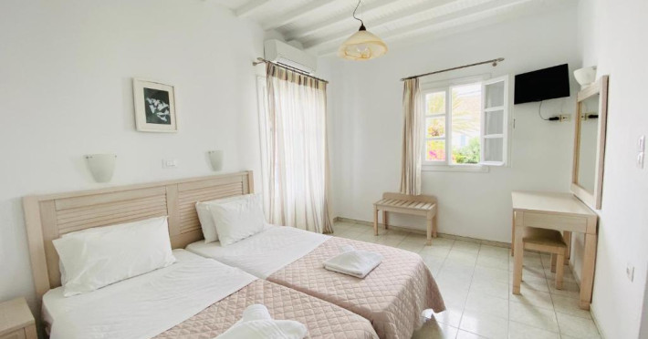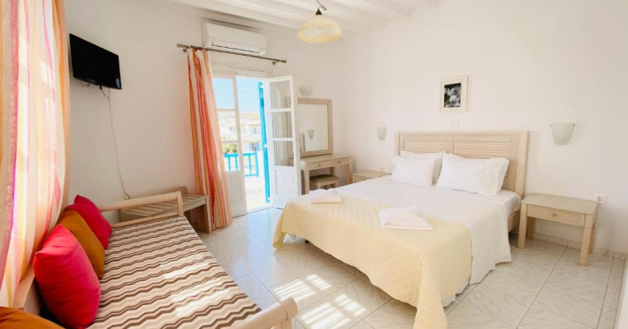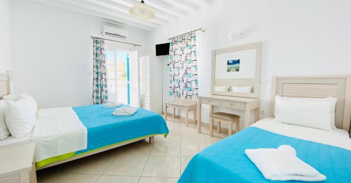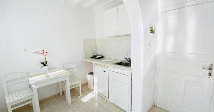 Camerele au balcon cu masă și scaune unde pot fi petrecute momente de relaxare. În camere există baie prevăzută cu foehn. Fiecare cameră dispune de cană-fierbător. Camerele confortabile de la Cyclades Studios au pardoseală de gresie/ marmură, aer condiționat, Tv cu canale prin satelit și seif. Curățenia in cameră se face zilnic. Fiecare unitate de cazare include o chicinetă utilată cu frigider și ustensile de bucătărie. De asemenea, este disponibilă o zonă de luat masa. Proprietatea oferă camere pentru nefumători.