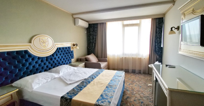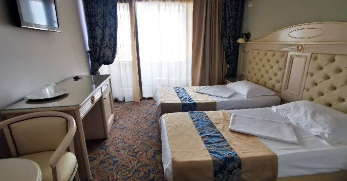Camerele duble- twin: au in dotare 2 paturi (90/200), aer conditionat, televizor LCD, minibar, baie cu dus sau cada, uscator par, balcon, internet wi-fi, pardoseala cu mocheta in camere si gresie in baie, geam termopan, plasa de tantari