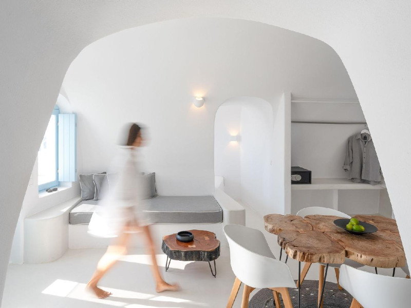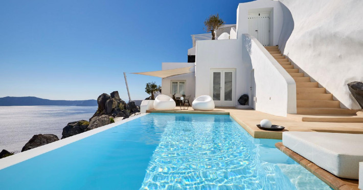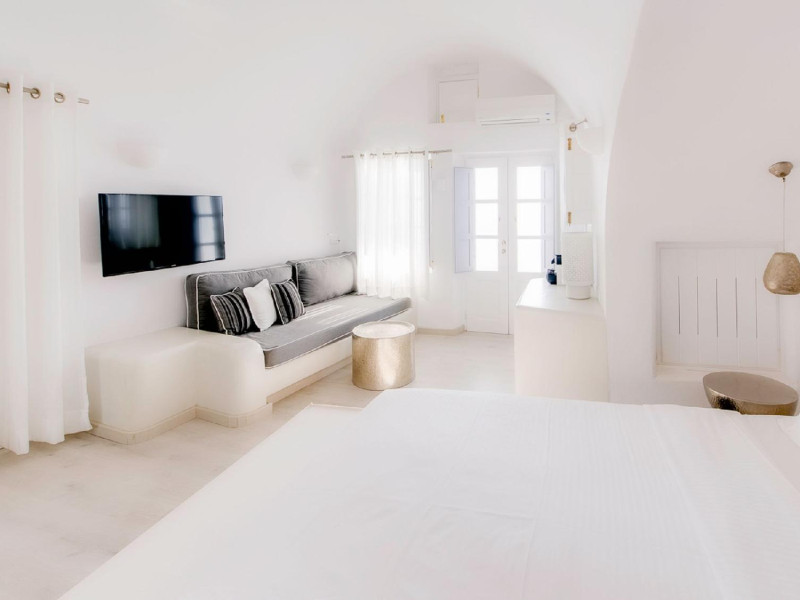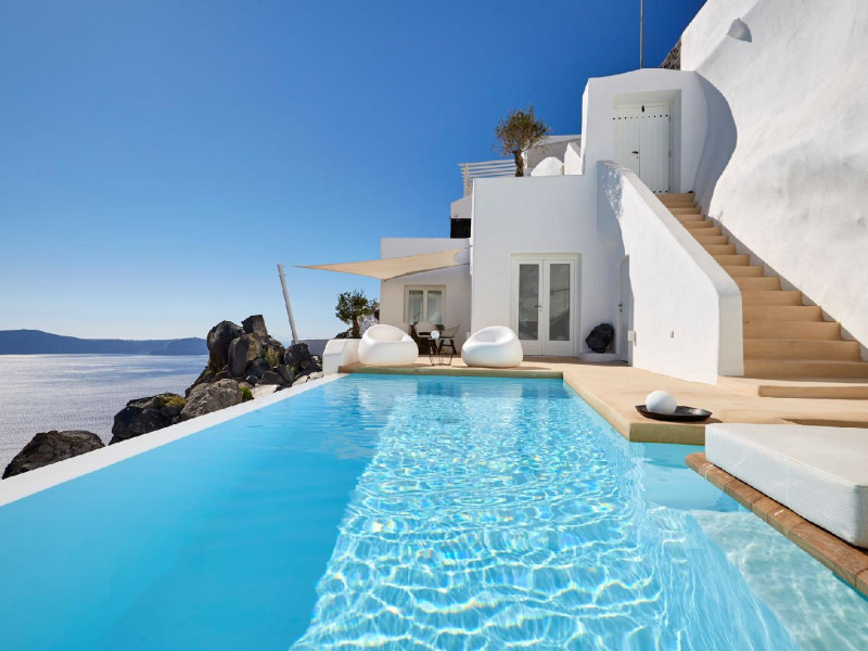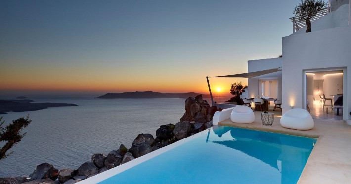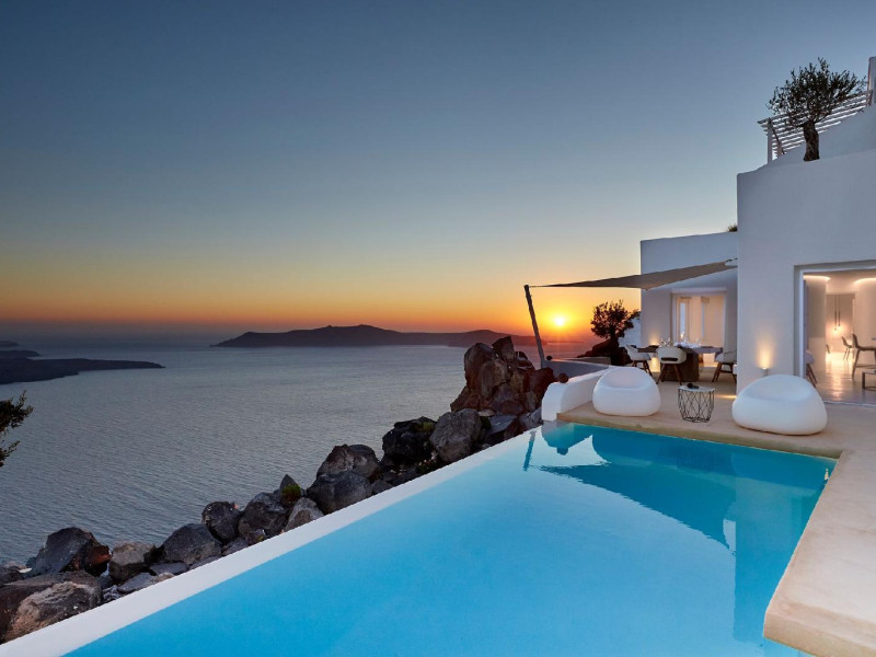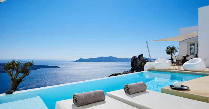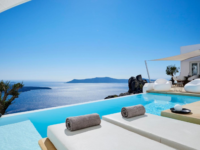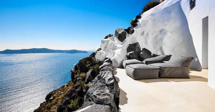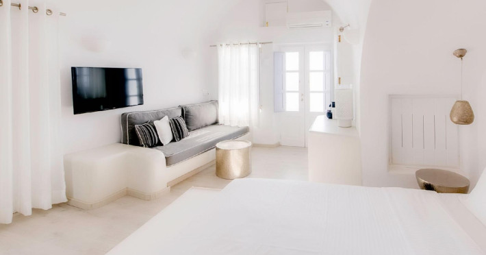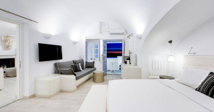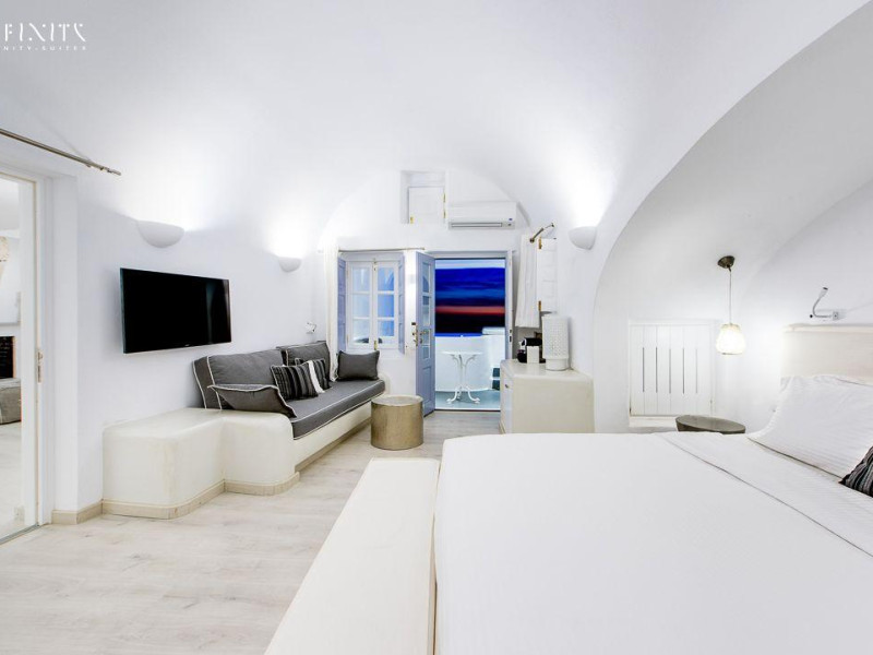 The Santorini villa Etheras derives her name from the Greek word for the fifth element, the so called quintessence. Etheras, along with fire, air, water, and earth, is the mystical element from which the world was made. Thus, the ancient Greeks attributed Etheras ideal qualities, like a worldly presented element derived from the home of the Gods. The villa Etheras true to her name, compiles key aesthetic principles such as a spacious living room, two bedrooms with ensuite bathrooms, and a fully-equipped kitchen while it can host up to four guests. Villa Etheras hangs imposingly from the rocks where its exterior spreads over 130 sq.m. The villa's private surrounding patio offers plenty of luxurious touches like a private infinity swimming pool, outdoor dining area, pool and off-pool loungers , all complementing the perfect relaxation canvas. Enjoy the warmth of Santorini's sun as you admire the breathtaking panoramic views of the caldera. The outdoor area of Villa Etheras is an extension of the rock and combine endless views with privacy.The Santorini villa Etheras derives her name from the Greek word for the fifth element, the so called quintessence. Etheras, along with fire, air, water, and earth, is the mystical element from which the world was made. Thus, the ancient Greeks attributed Etheras ideal qualities, like a worldly presented element derived from the home of the Gods. The villa Etheras true to her name, compiles key aesthetic principles such as a spacious living room, two bedrooms with ensuite bathrooms, and a fully-equipped kitchen while it can host up to four guests. Villa Etheras hangs imposingly from the rocks where its exterior spreads over 130 sq.m. The villa's private surrounding patio offers plenty of luxurious touches like a private infinity swimming pool, outdoor dining area, pool and off-pool loungers , all complementing the perfect relaxation canvas. Enjoy the warmth of Santorini's sun as you admire the breathtaking panoramic views of the caldera. The outdoor area of Villa Etheras is an extension of the rock and combine endless views with privacy.
